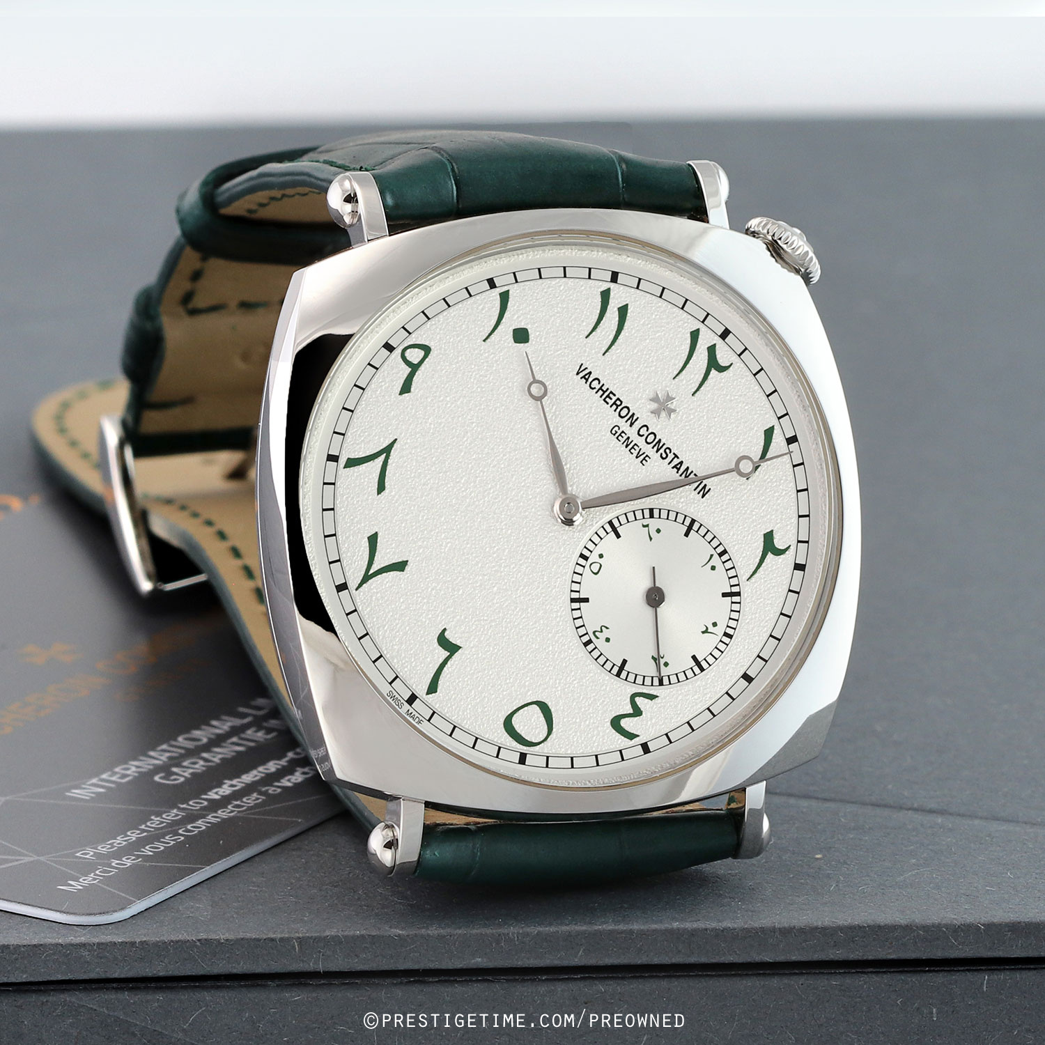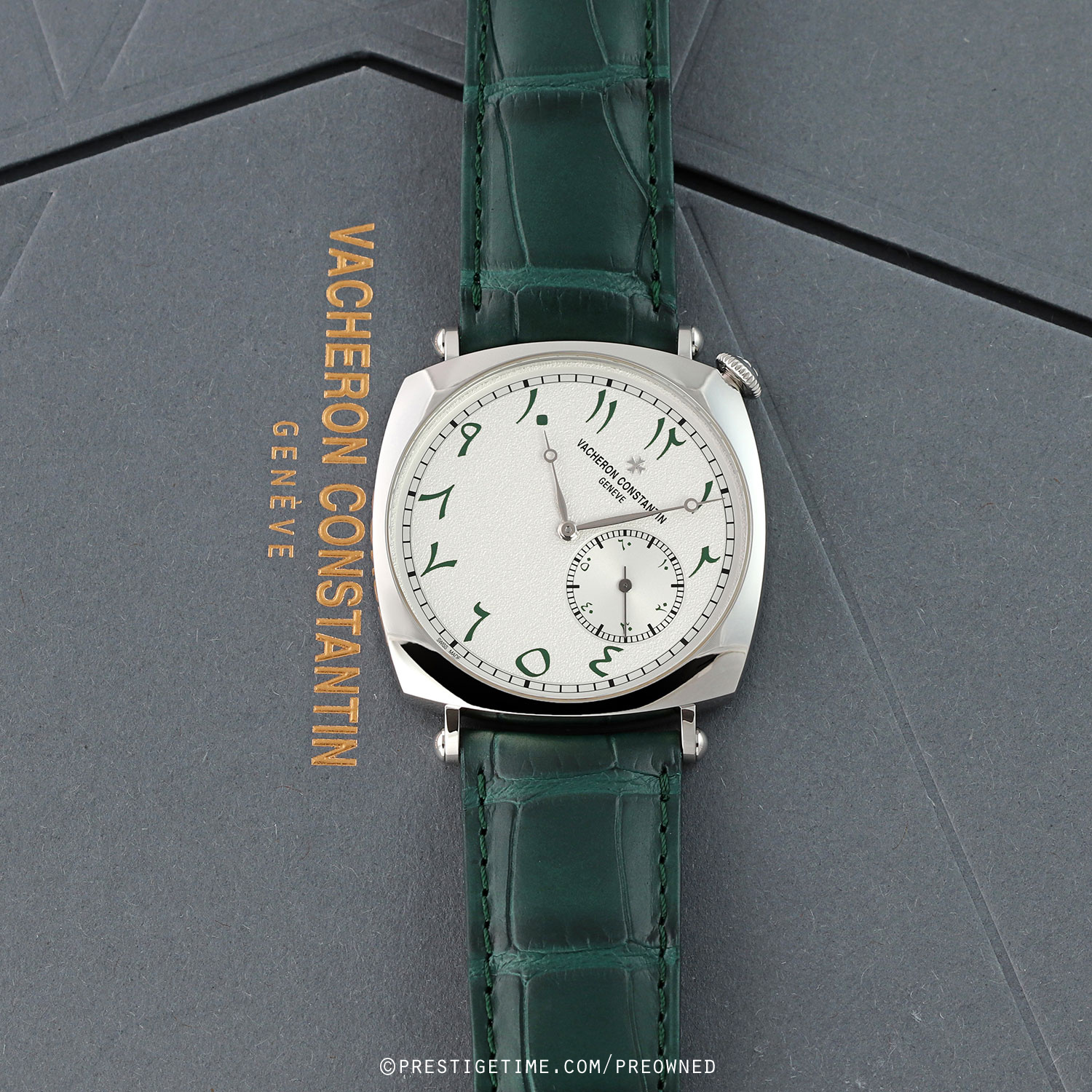 The Vacheron Constantin Historiques American 1921 is one of the most distinctive designs in fine watchmaking. Originally created in 1921 for the American market, it features a cushion-shaped case, a diagonally rotated dial for easy reading while driving, and a crown uniquely positioned between 1 and 2 o’clock.This particular version is an exceptionally rare regional edition created primarily for the Middle Eastern market, distinguished by striking green Eastern Arabic numerals and a matching green strap. Produced in very limited quantities and seldom seen outside the region, it stands among the most elusive modern variations of the iconic 1921.