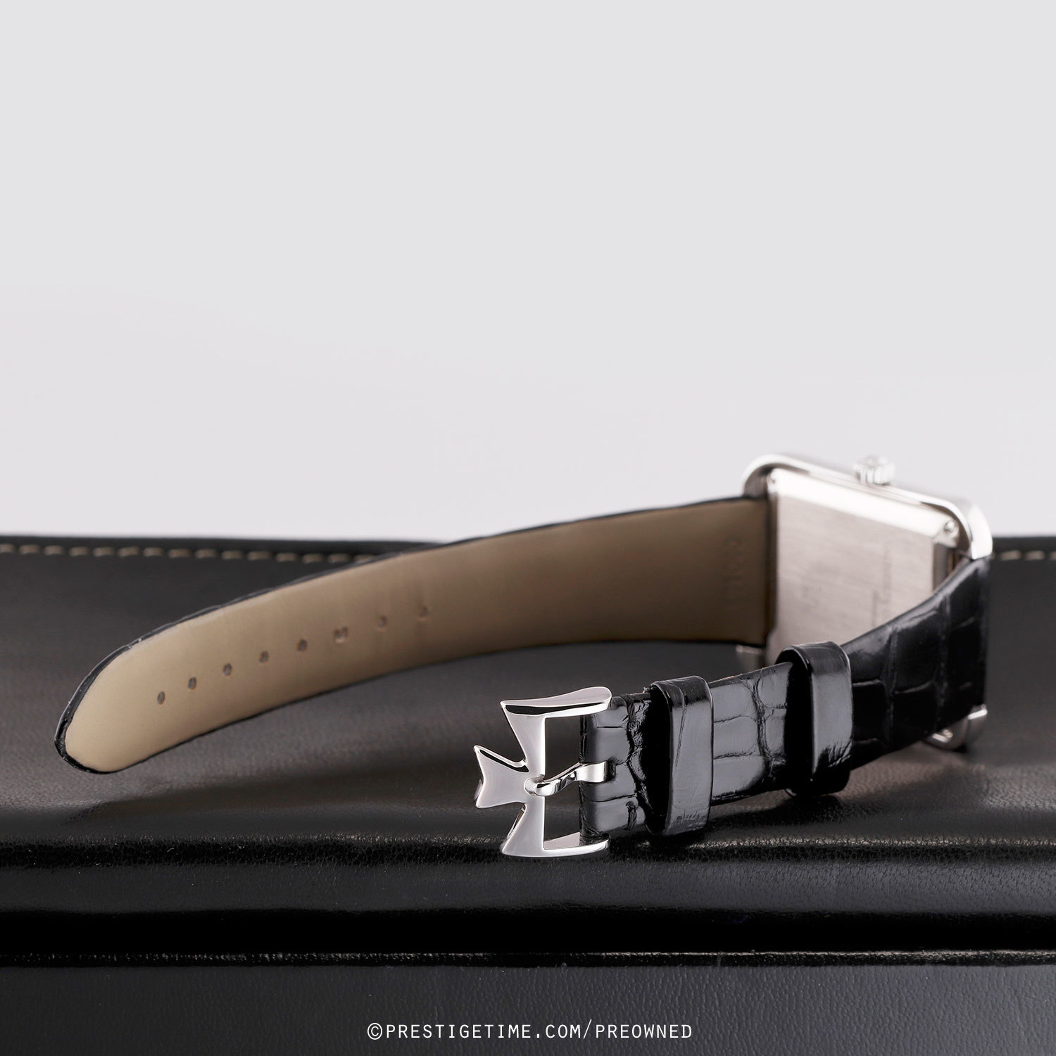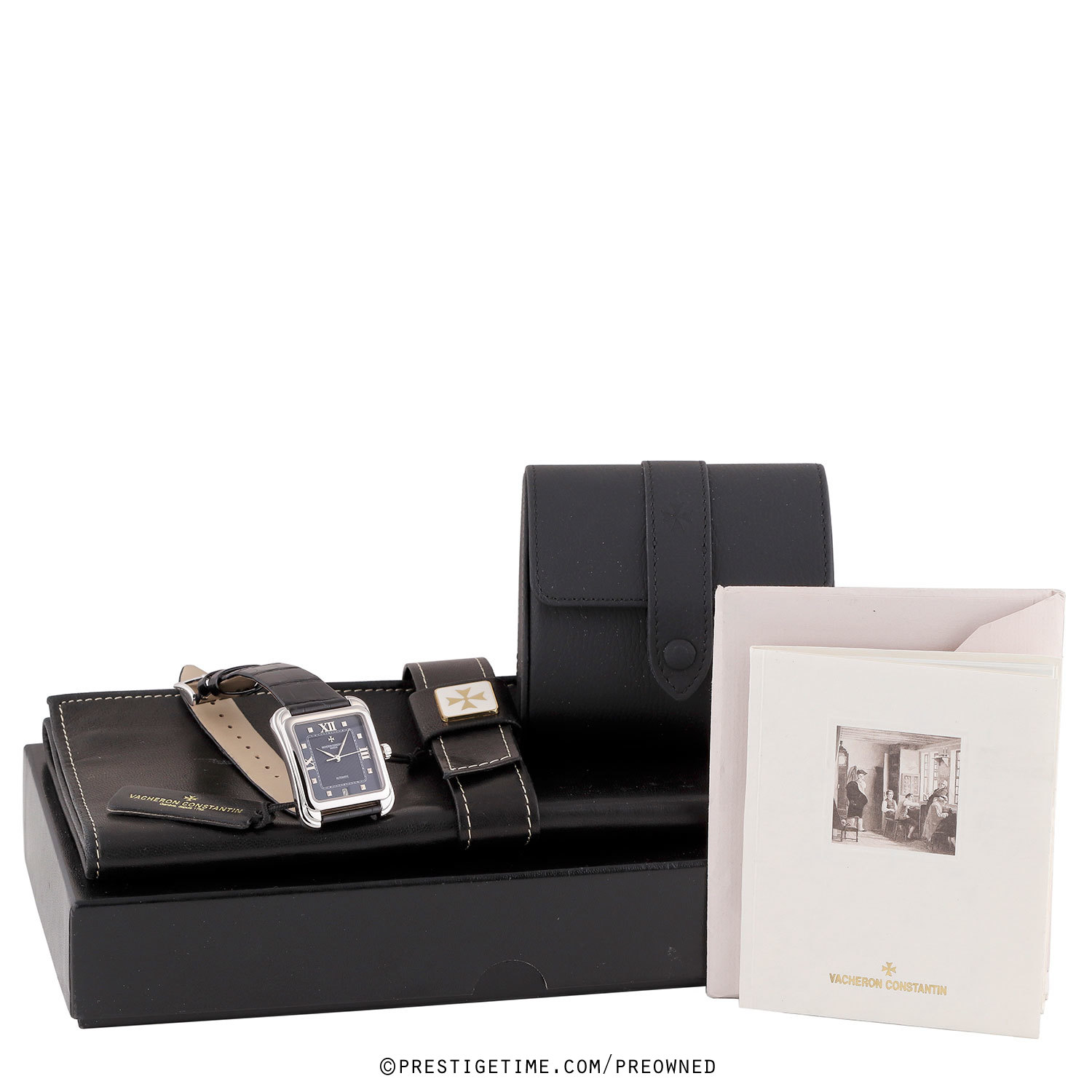 Strap: Fitted on a brand new & unworn Vacheron Constantin rolled-edge shiny black alligator leather strap with a polished 18kt white gold Maltese Cross tang buckle. The buckle is stamped with the Vacheron Constantin hallmarks.