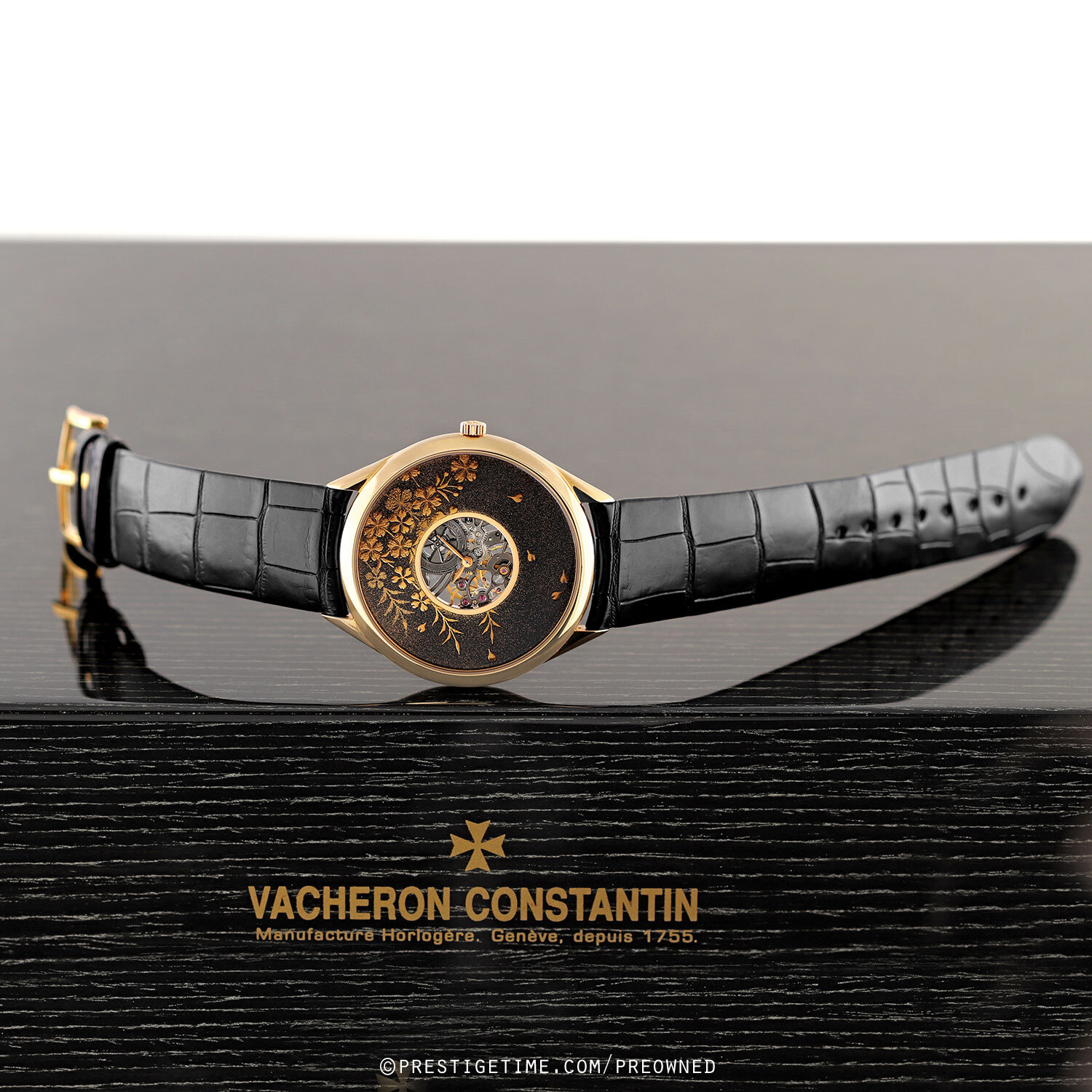 Strap: Fitted on its original Vacheron Constantin rolled-edge black alligator leather strap with a solid 18kt rose gold buckle. The strap is unworn with its full wear lifespan remaining.
