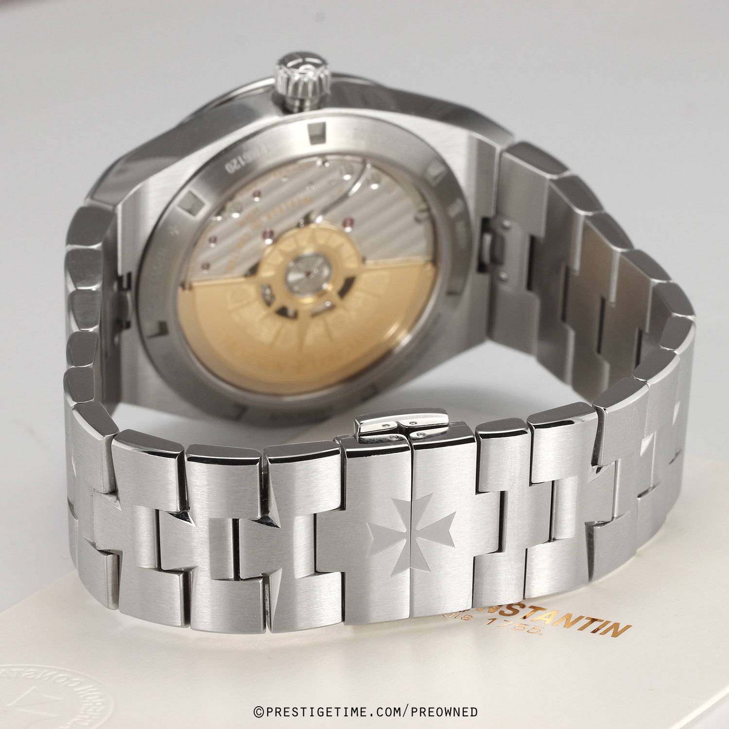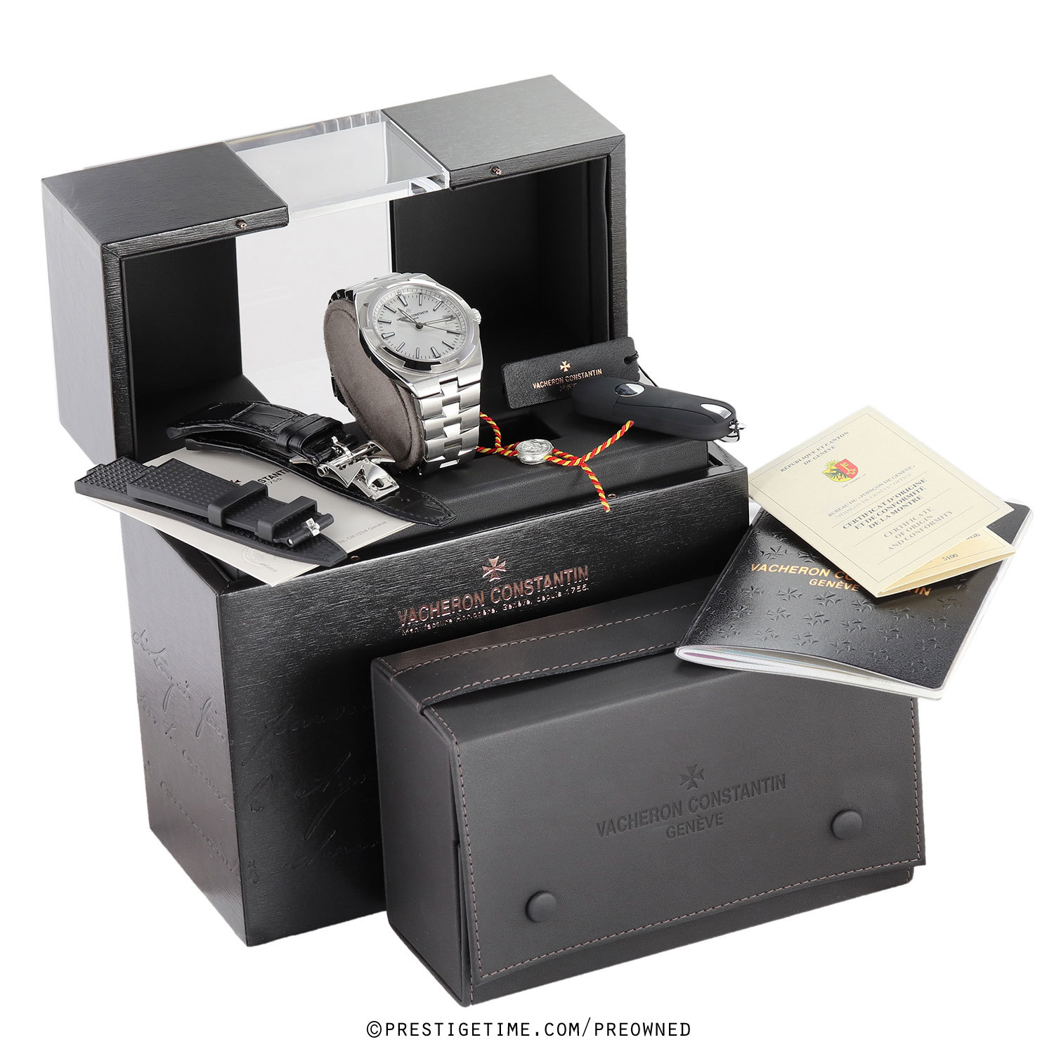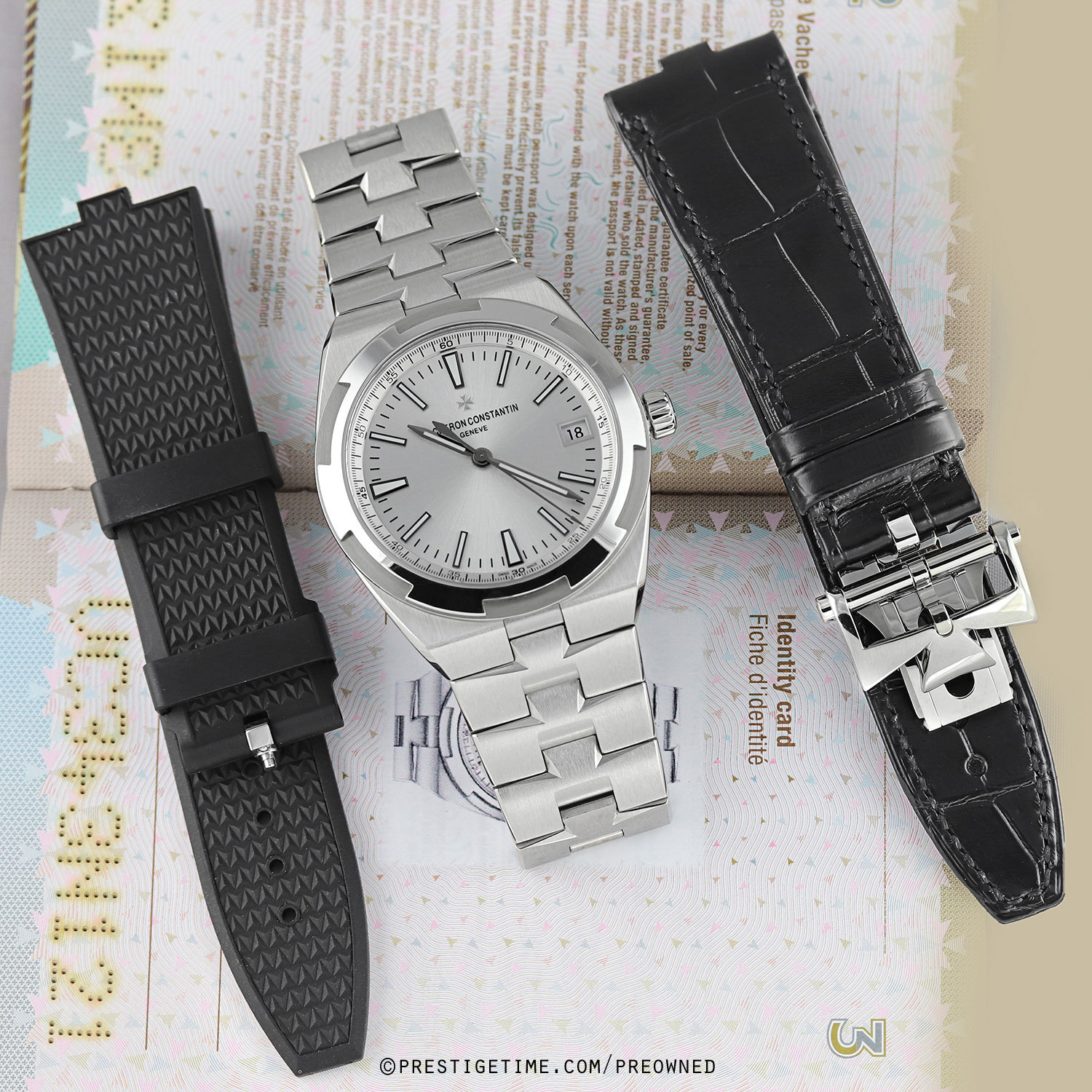 Strap: The watch is fitted on its original brushed & polished stainless steel bracelet with a push button deployant clasp. The bracelet is fully linked & will fit up to a 8" wrist. Included with the watch are two OEM Vacheron Constantin straps & a single deployant buckle. 1) Black alligator leather: This strap is in near brand new condition with full life remaining, we would rate it as 98% condition. 2) Black rubber: complete unworn. The bracelet/straps/buckle are interchangeable via a unique interchangeable strap/bracelet system - no tools necessary.