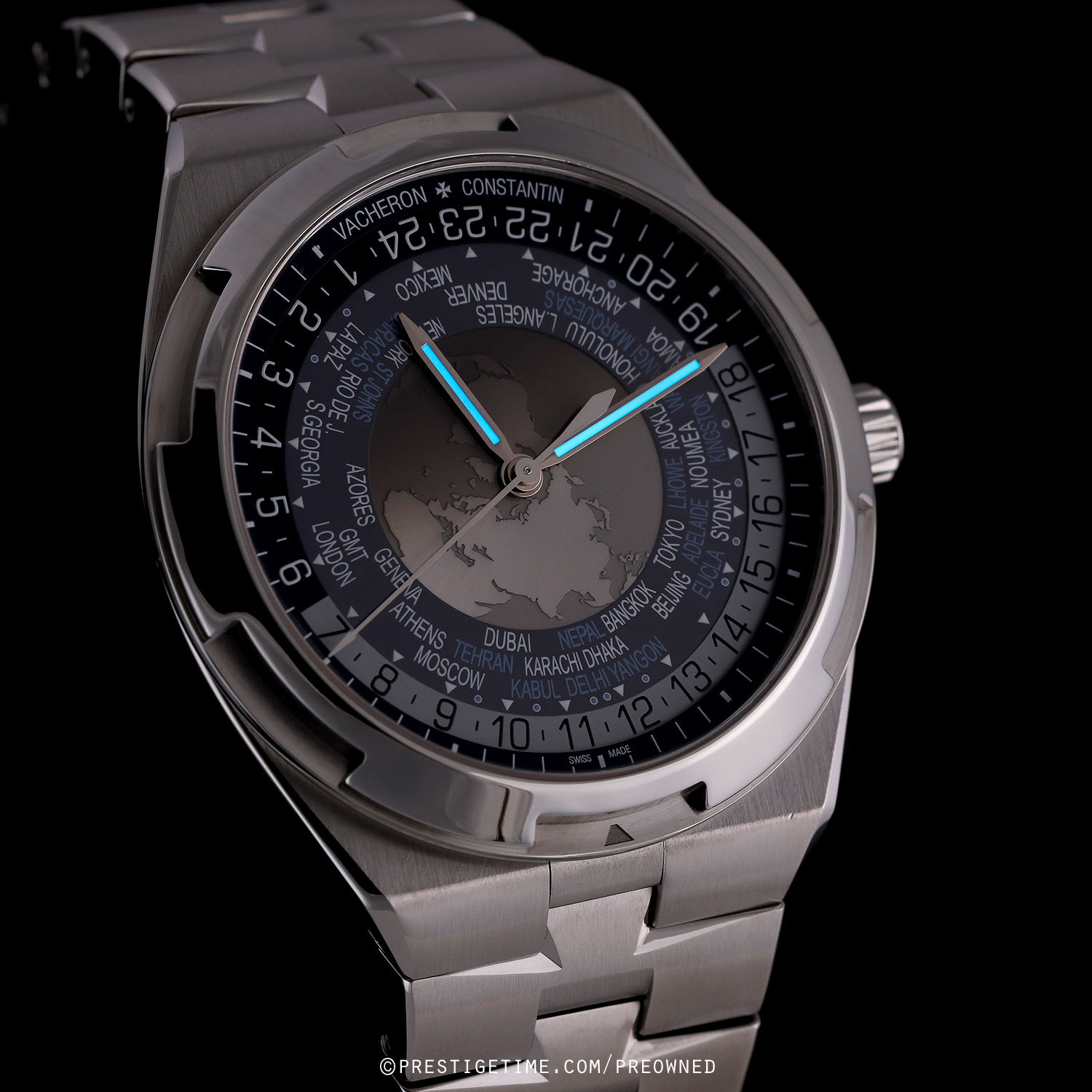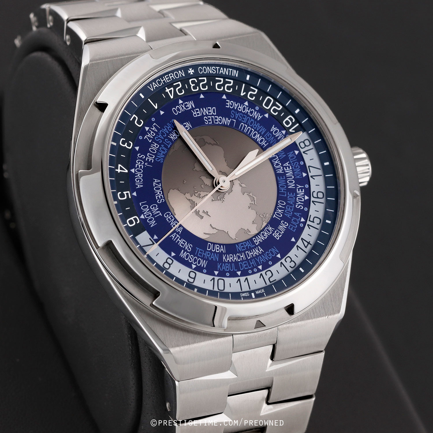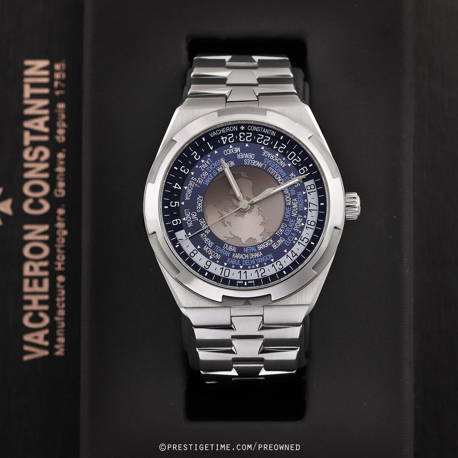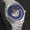 Case & dial: Brushed & polished stainless steel case. The center of the dial features a world map as it appears from the northern hemisphere, with satin finished continents & velvet finished seas. A sapphire disc overlays the center dial with a tinted zone for night & clear for day. Blue inner dial ring with 37 city locations, including those off-set by a half or quarter of an hour elative to UTC time. Black (night) & white (day) 24-hour ring. Very dark blue dial flange with with printed hours & minutes track. Polished hands, the hour & minute hands with luminous fill.