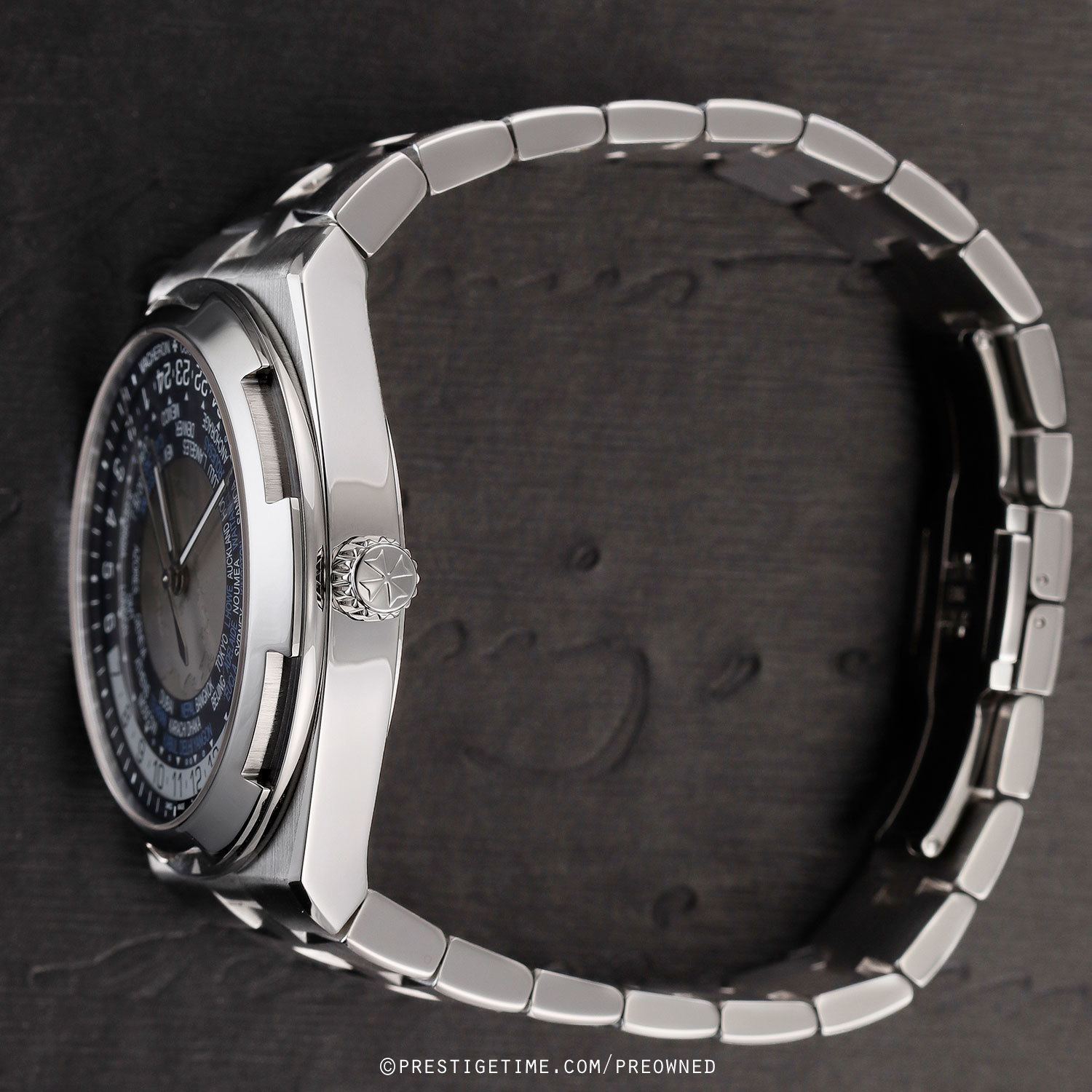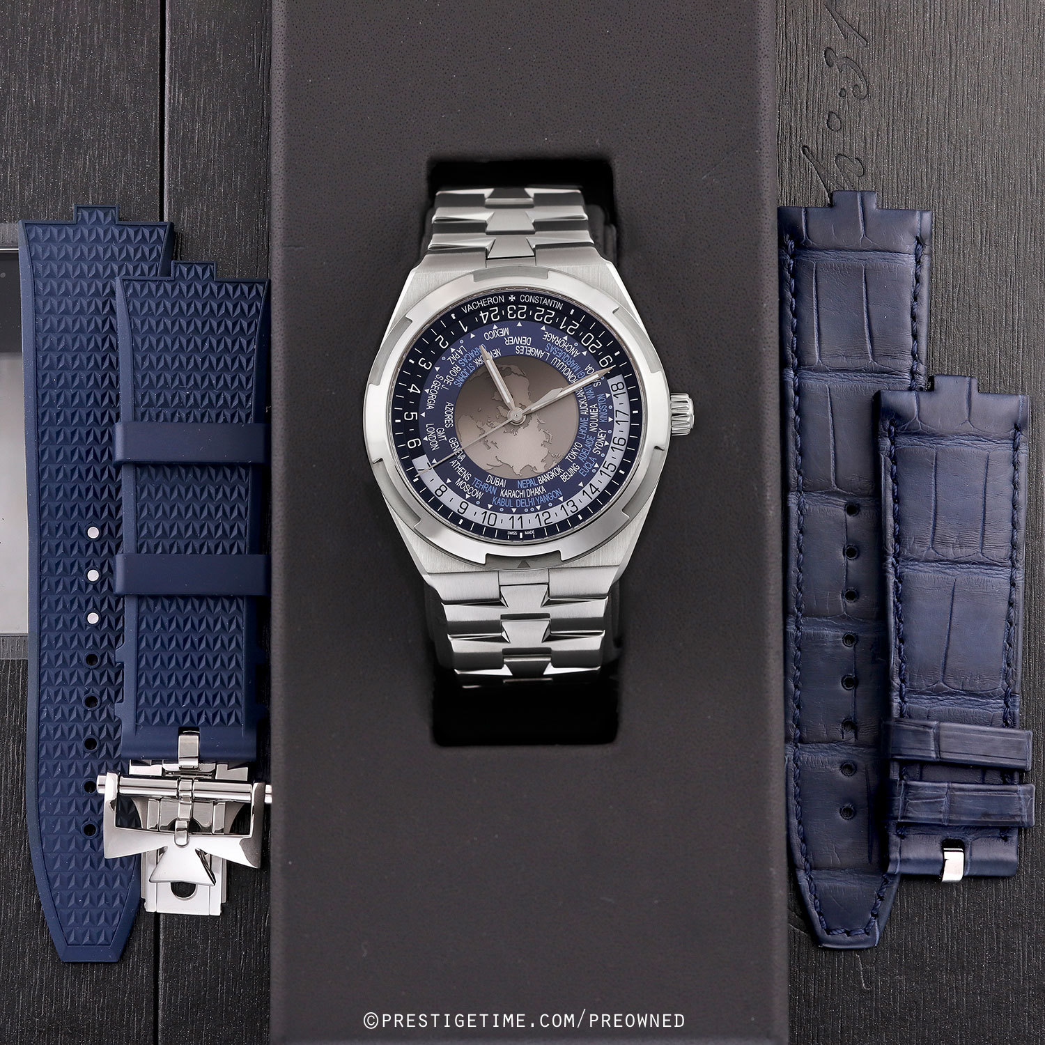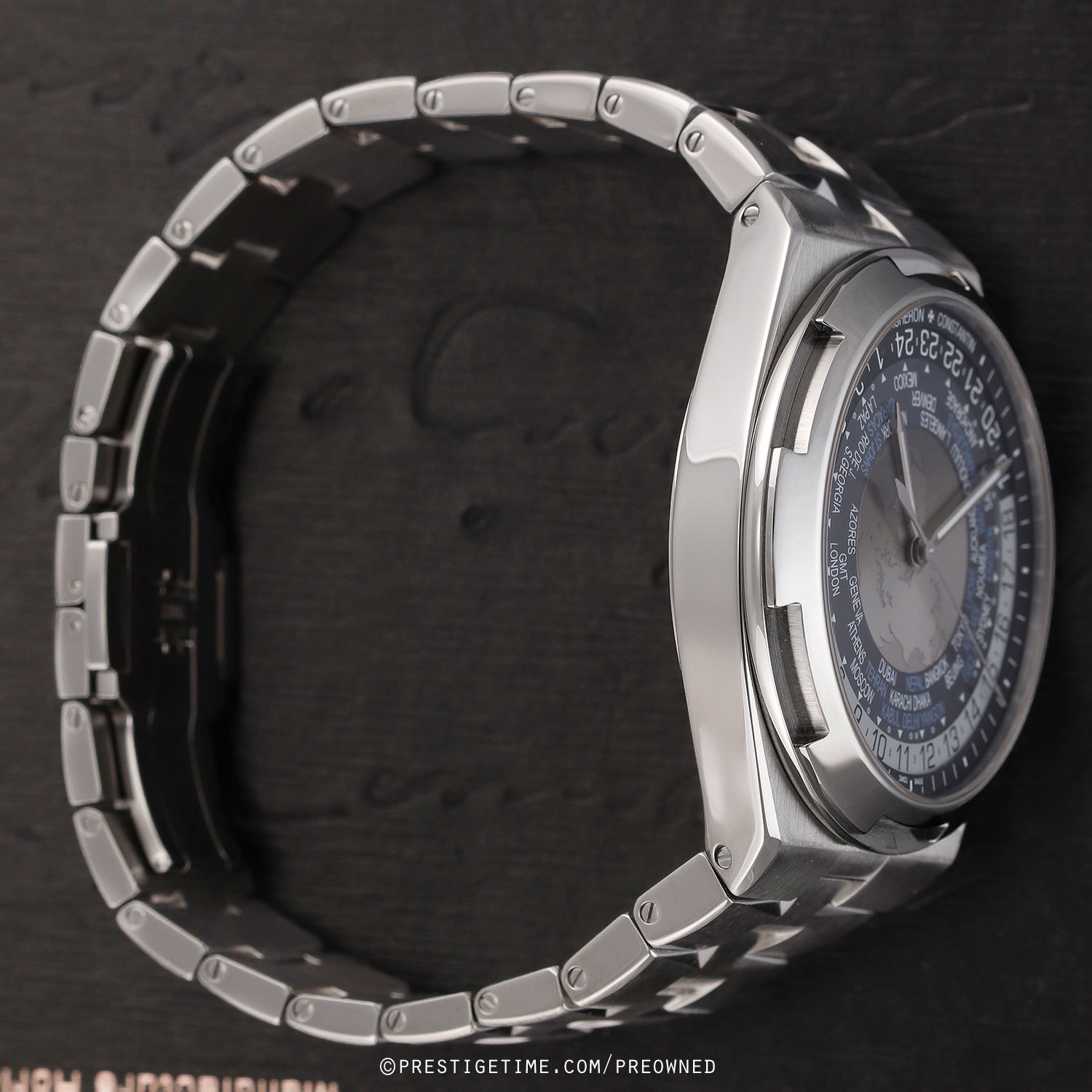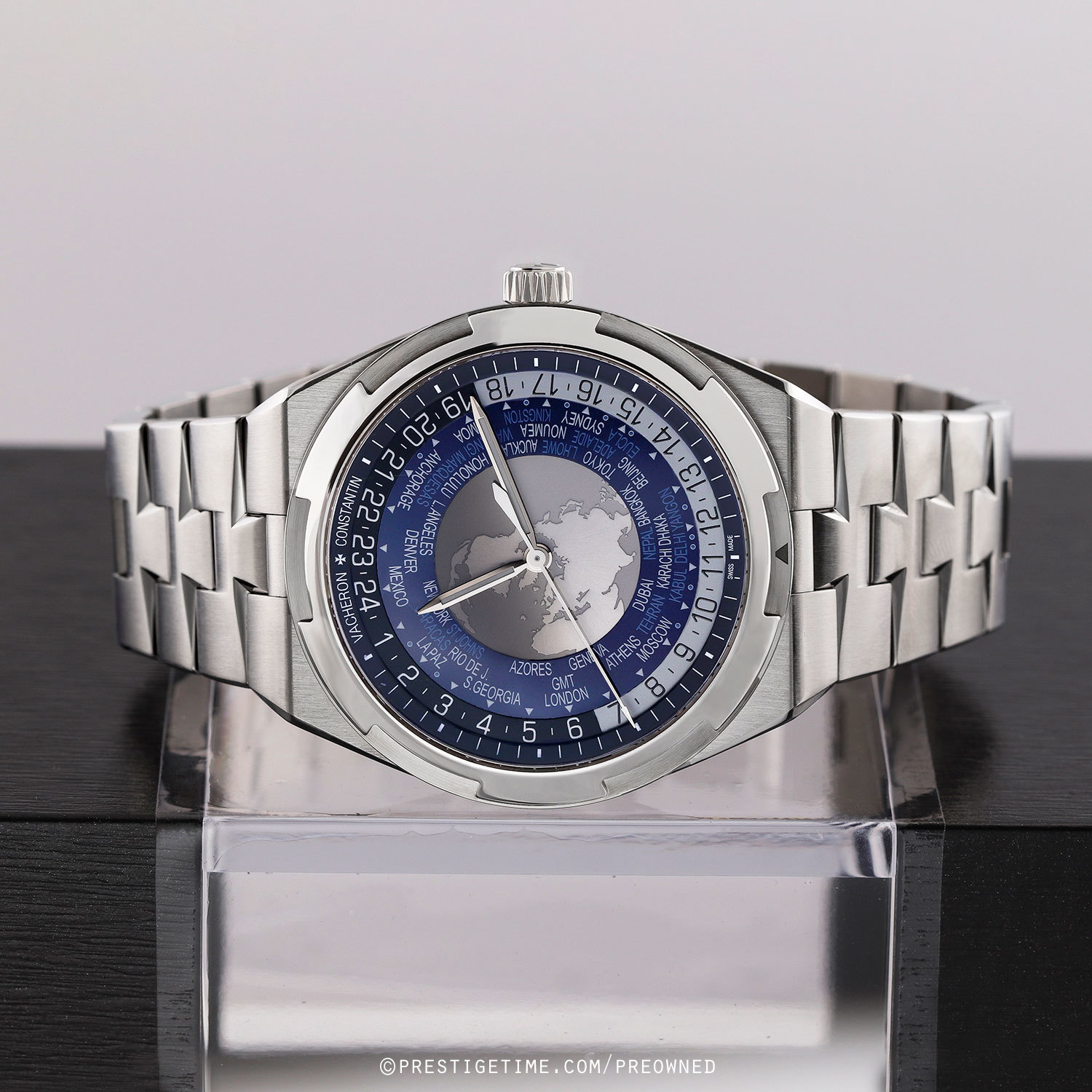 Case & dial: Brushed & polished stainless steel case. The center of the dial features a world map as it appears from the northern hemisphere, with satin finished continents & velvet finished seas. A sapphire disc overlays the center dial with a tinted zone for night & clear for day. Blue inner dial ring with 37 city locations, including those off-set by a half or quarter of an hour elative to UTC time. Black (night) & white (day) 24-hour ring. Very dark blue dial flange with with printed hours & minutes track. Polished hands, the hour & minute hands with luminous fill.