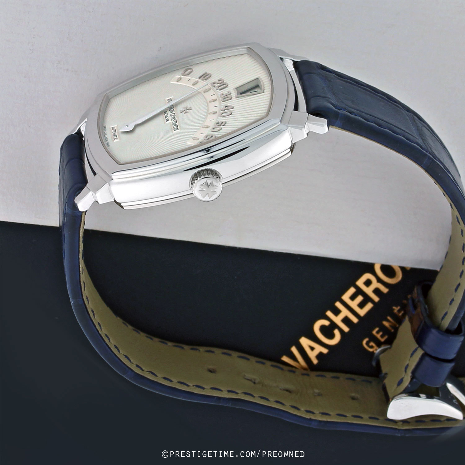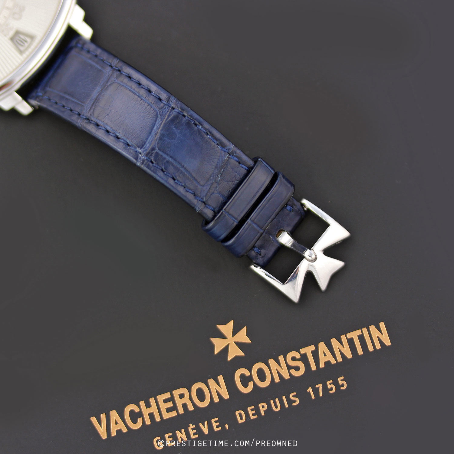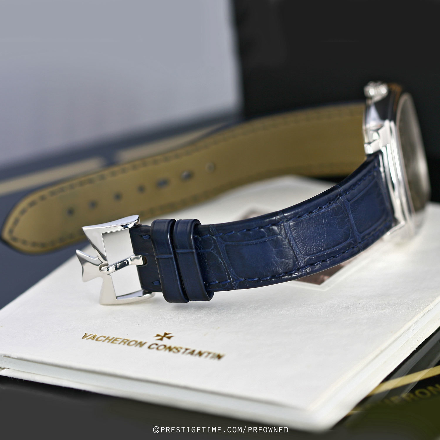 Fitted on a lightly worn Vacheron Constanin Original blue alligator strap & a signed 18kt white gold tang buckle. The strap is in very good condition with plenty of wear-time remaining.
