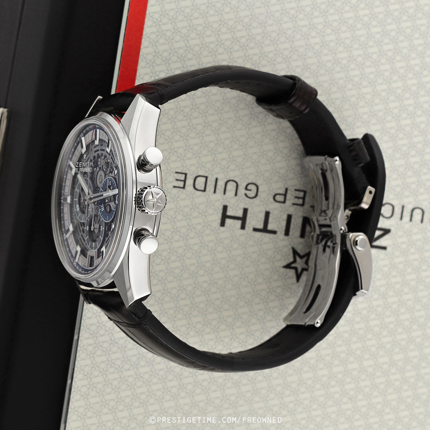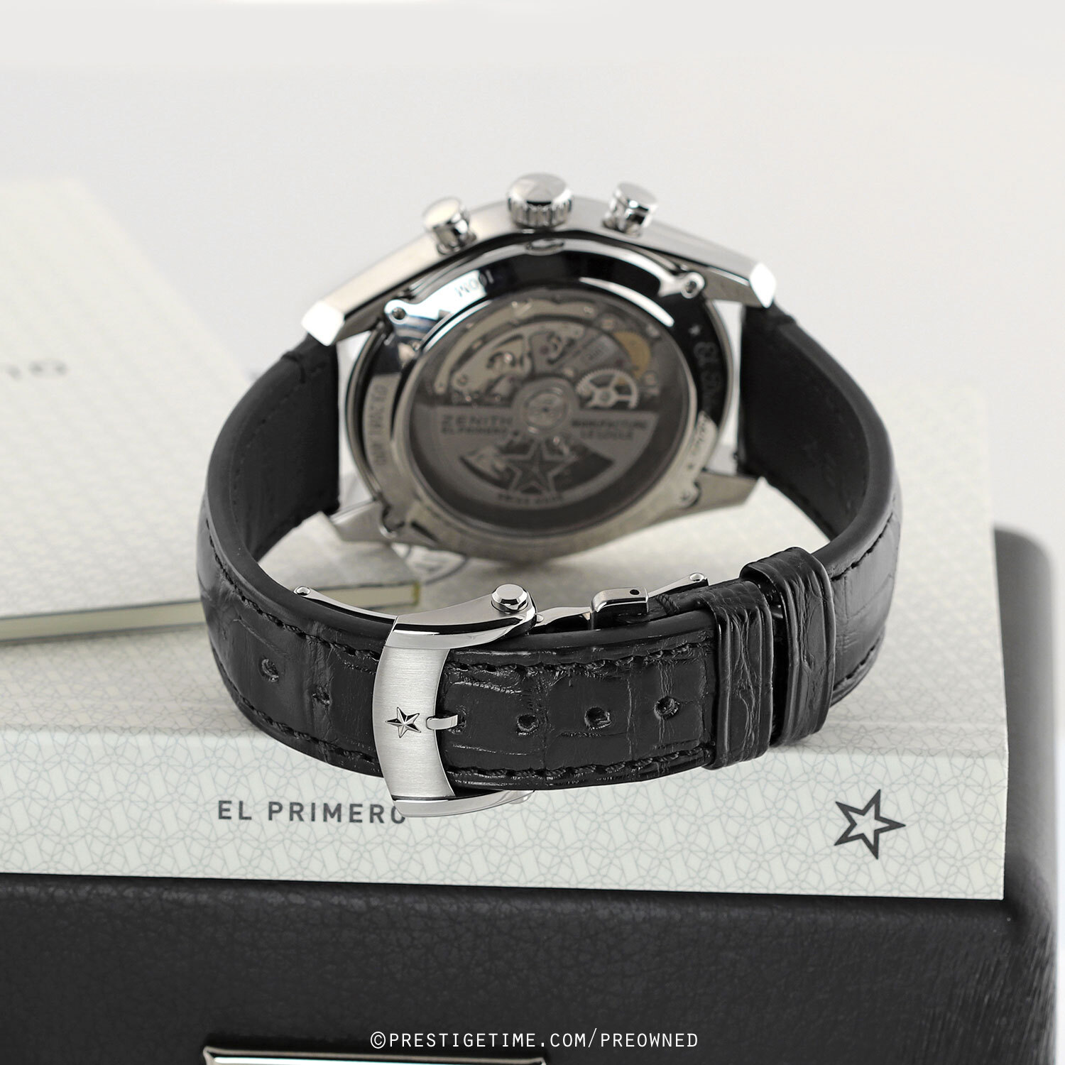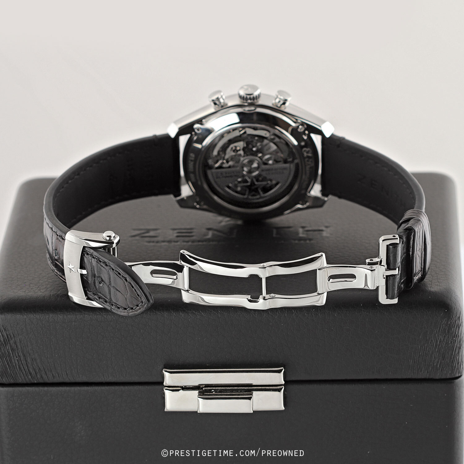Strap: Fitted on its original Zenith black alligator leather strap with a stainless steel push-button deployant buckle. The strap is in near new condition with its full life-span remaining, we would rate the strap in 98%+ condition.