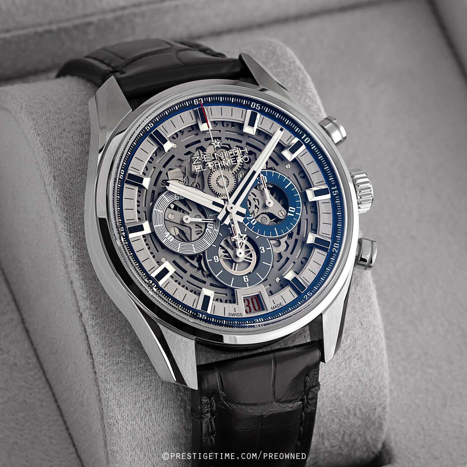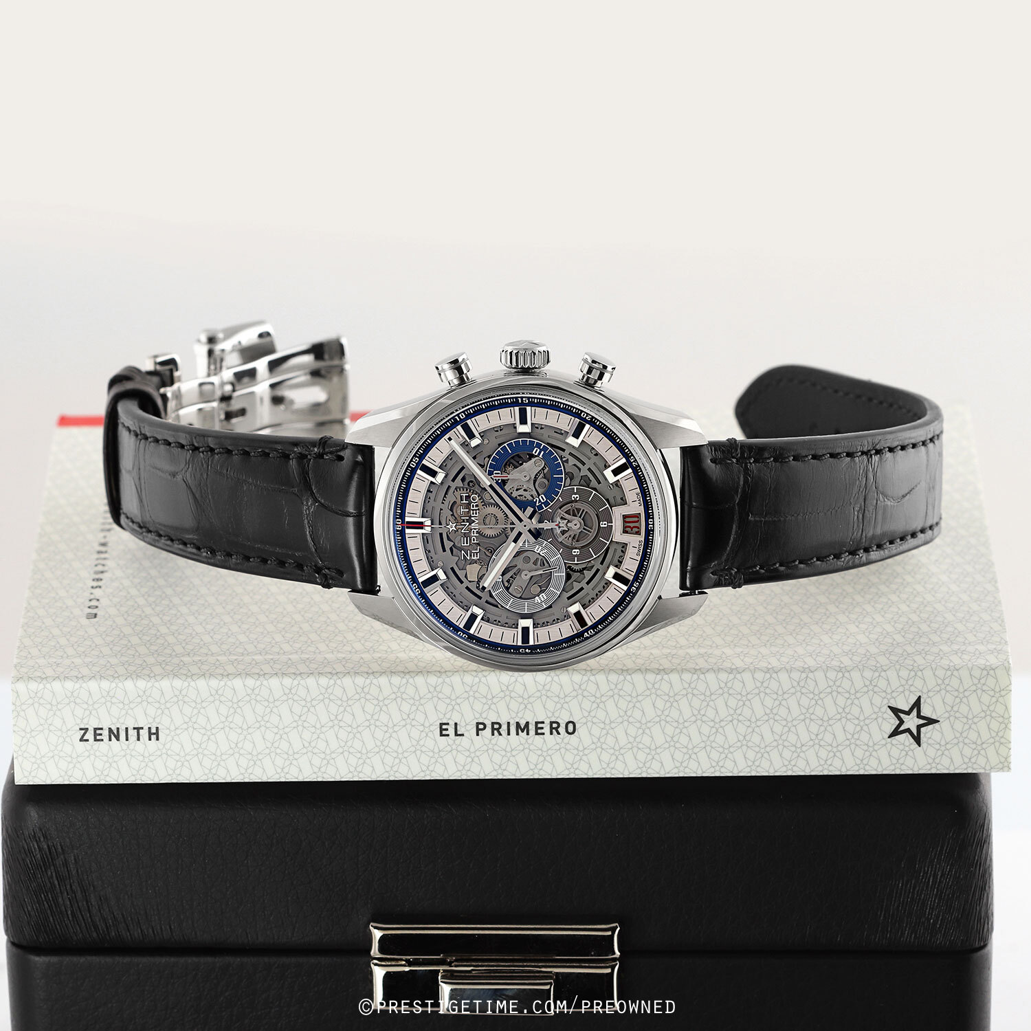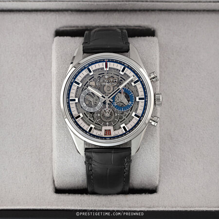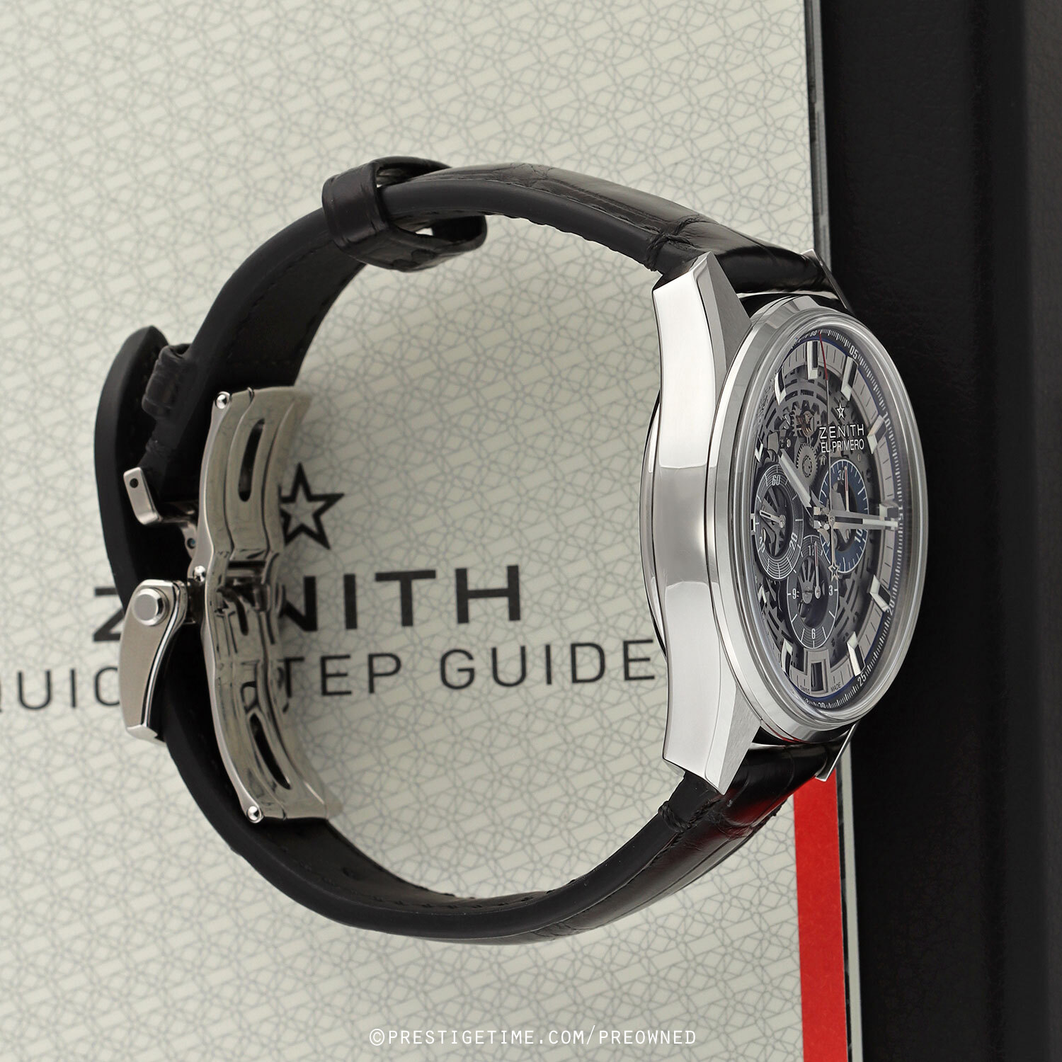 Case: Brushed & polished stainless steel case. Skelton dial with Zeniths iconic tri-color rimmed sub-dials. Polished hands, the hour & minute hands are with luminous fill. Black, blue & silver dial flange. Applied polished faceted index hour markers with luminous tips. Fine printed minute/seconds track. Small seconds sub-dial at 9 o'clock. Date window at 6 o'clock.