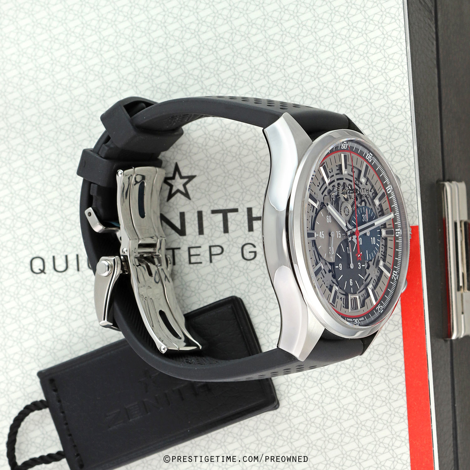 Strap: Fitted on its original Zenith black rubber strap with a stainless steel push-button deployant buckle. The strap is in excellent near new condition with the majority of its wear life-span remaining.  We would rate the strap in 95%+ overall condition.