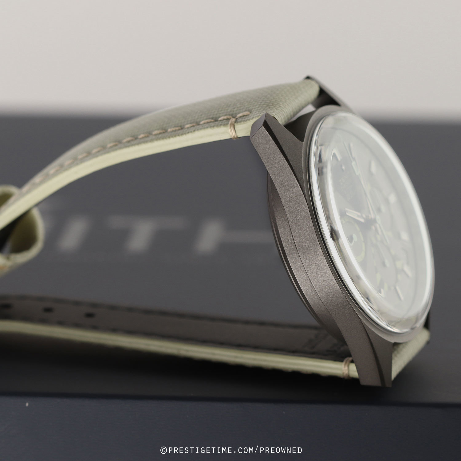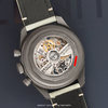 Case: Microblasted titanium case. Black on black toned "poker chip" dial with luminous print & accents . Dial flange with Tachymeter scale. Polished hour & minute hands, All hands with luminous paint. Applied polished index hour markers with luminous fill. Fine printed minutes/seconds & fractions-of-a-second track. Small seconds sub-dial at 9 o'clock. Date window at 4.30 o'clock.