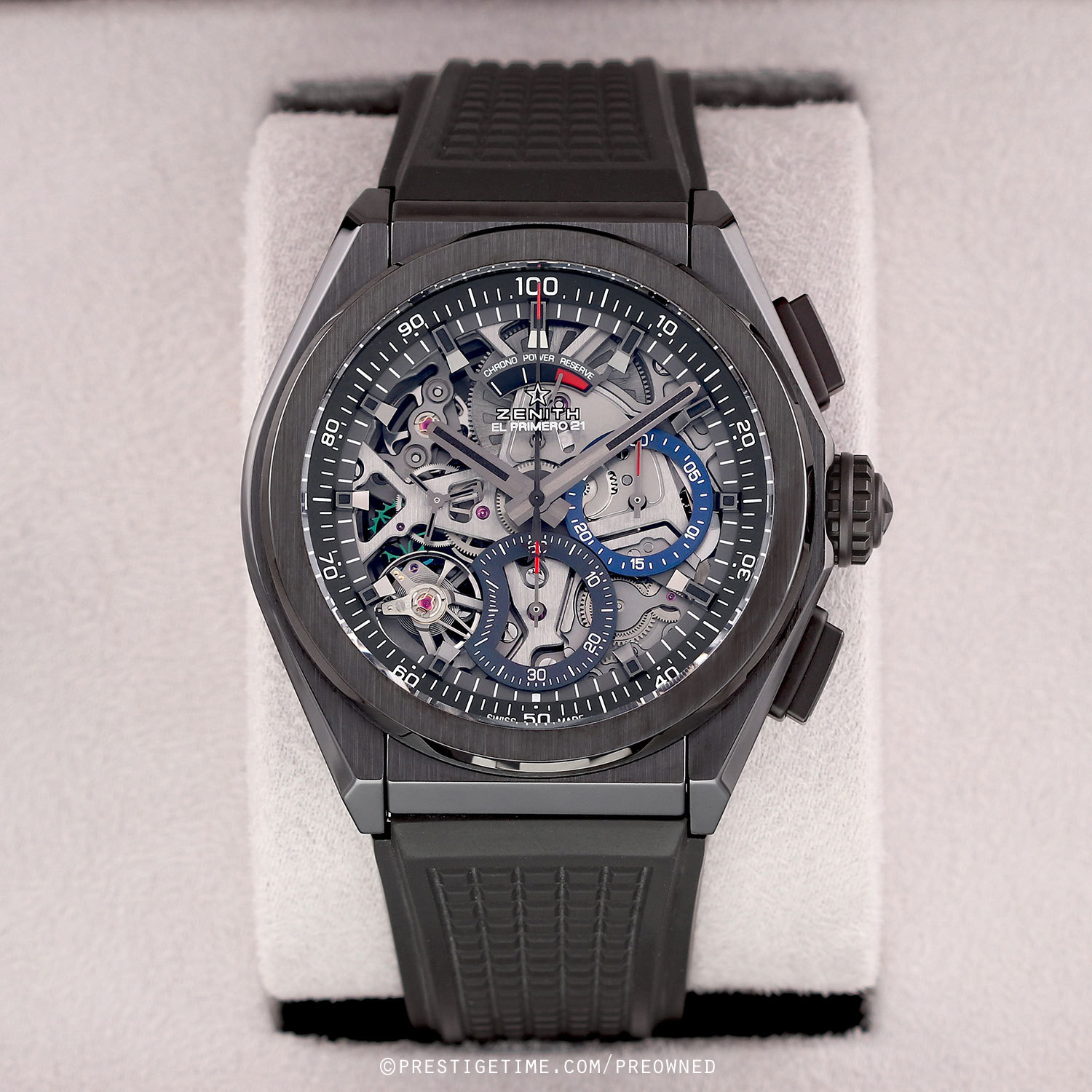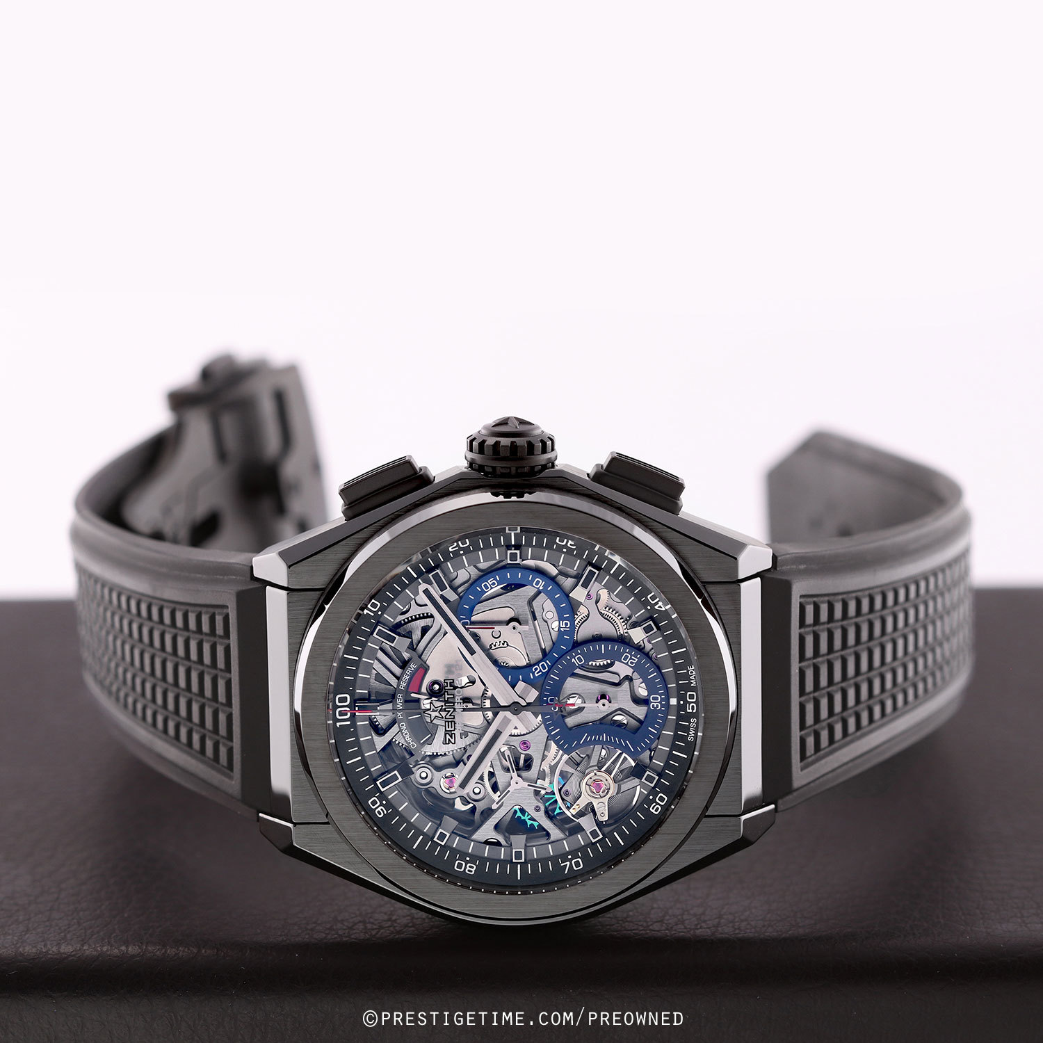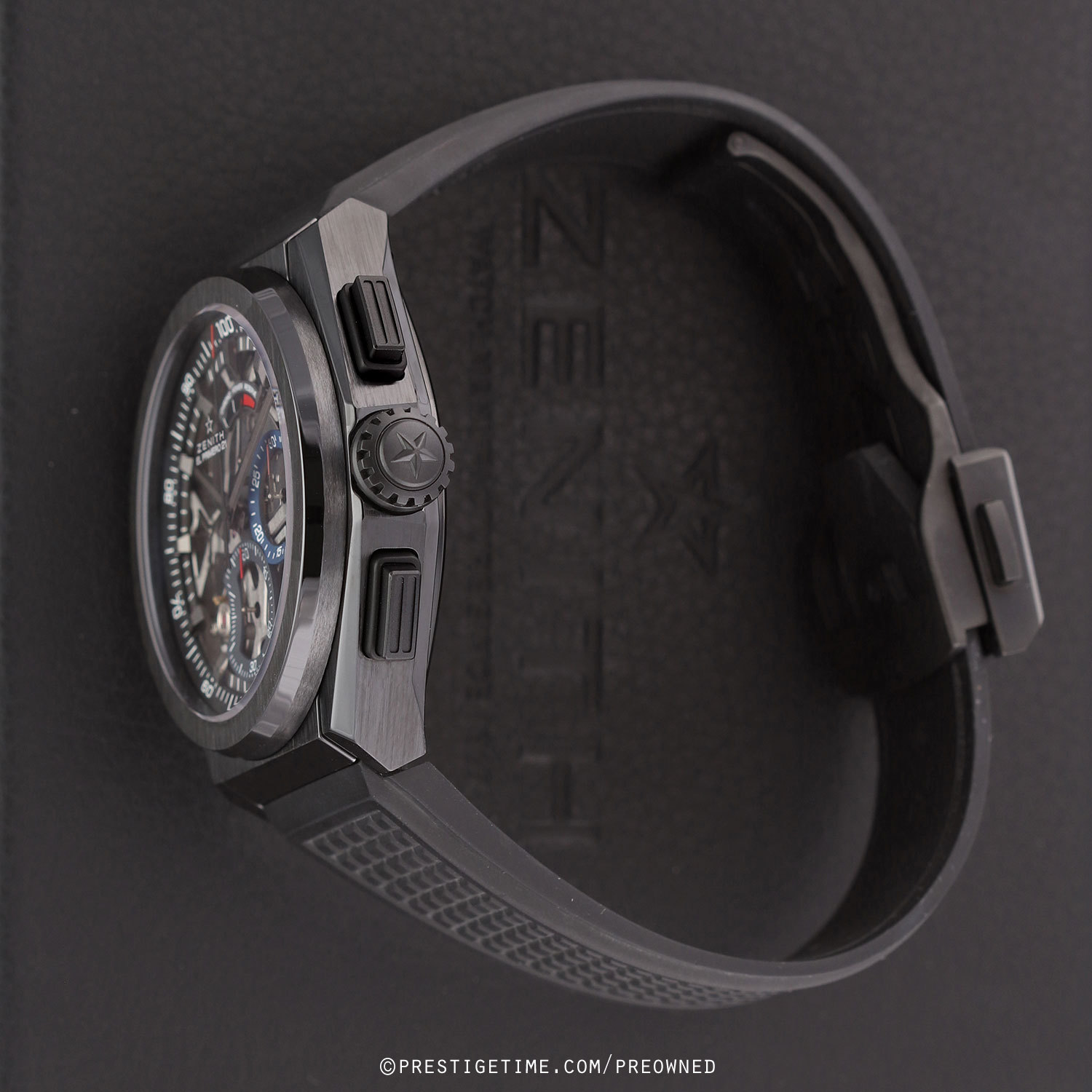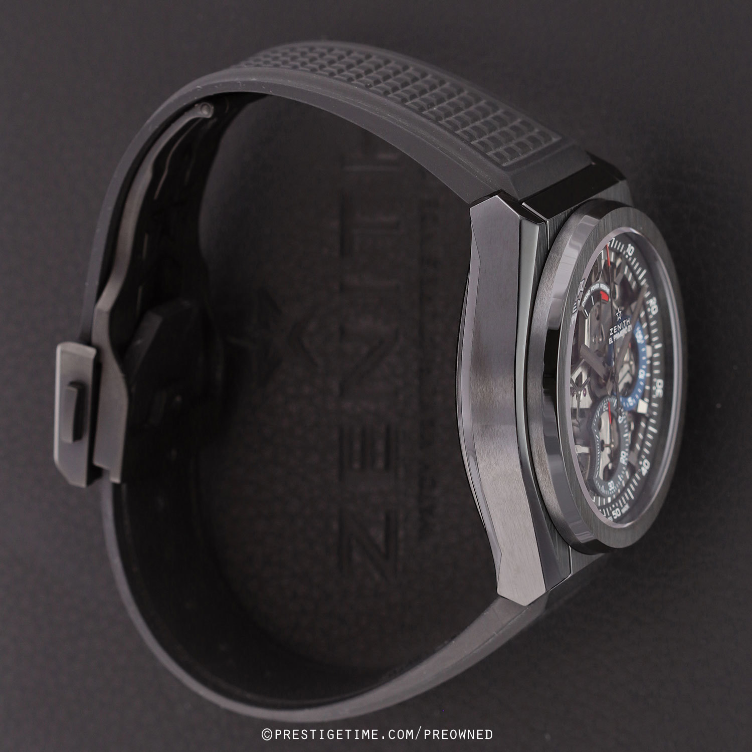 Strap: Fitted on its original Zenith black rubber strap with a push-button deployant buckle. This strap is in excellent near new condition with the majority of its wear lifespan remaining. We would be comfortable rating this strap in 97%+ condition.