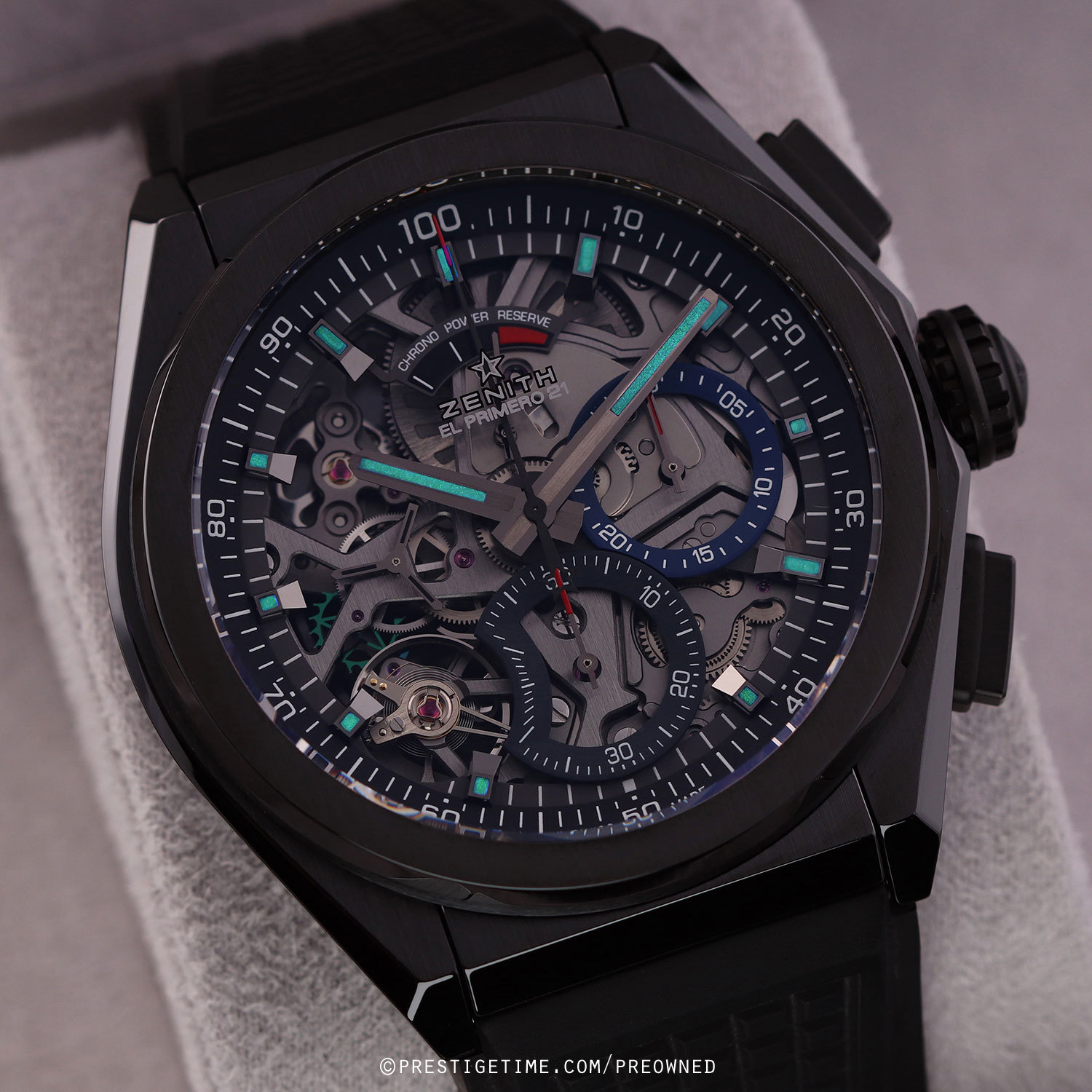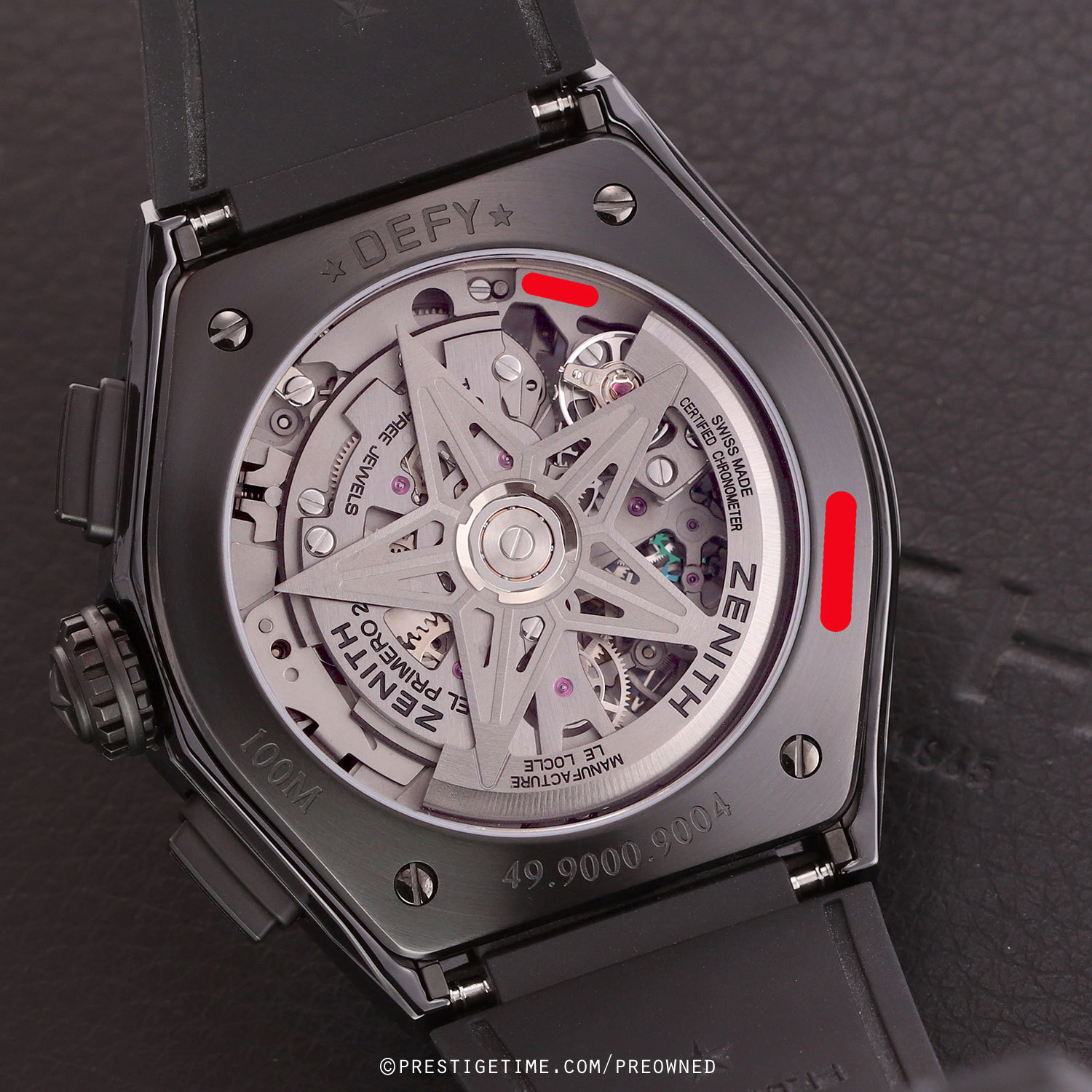 Movement: Powered by a Zenith in-house El Primero 9004 movement, dual escapements: watch escapement beats at 36,000 (5 Hz), the chrono escapement beats at 360,000 vpH (50Hz), contains 53 jewels & has a power reserve of +/- 50 hours.