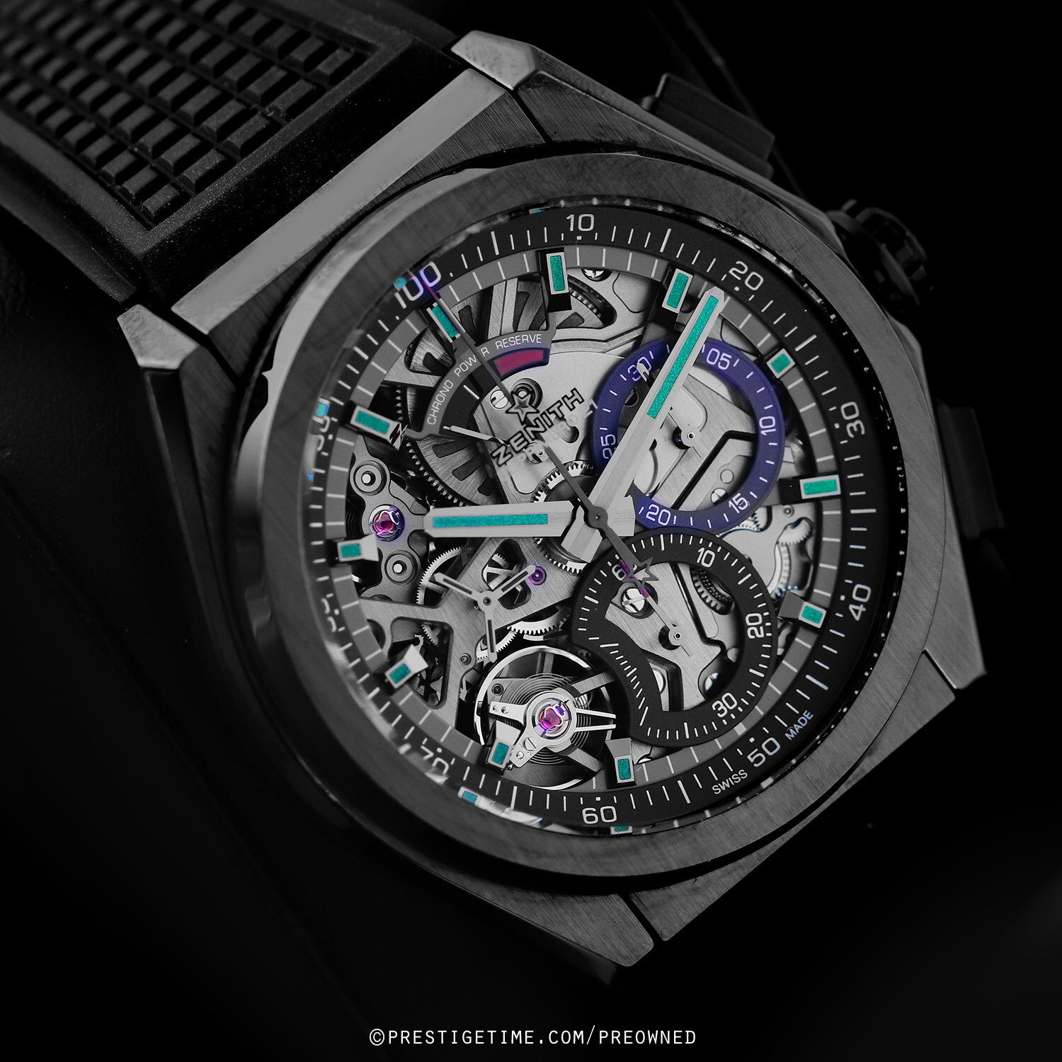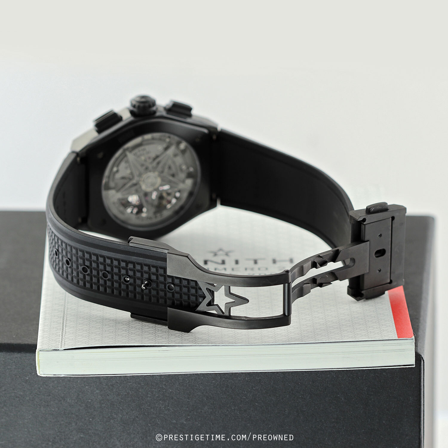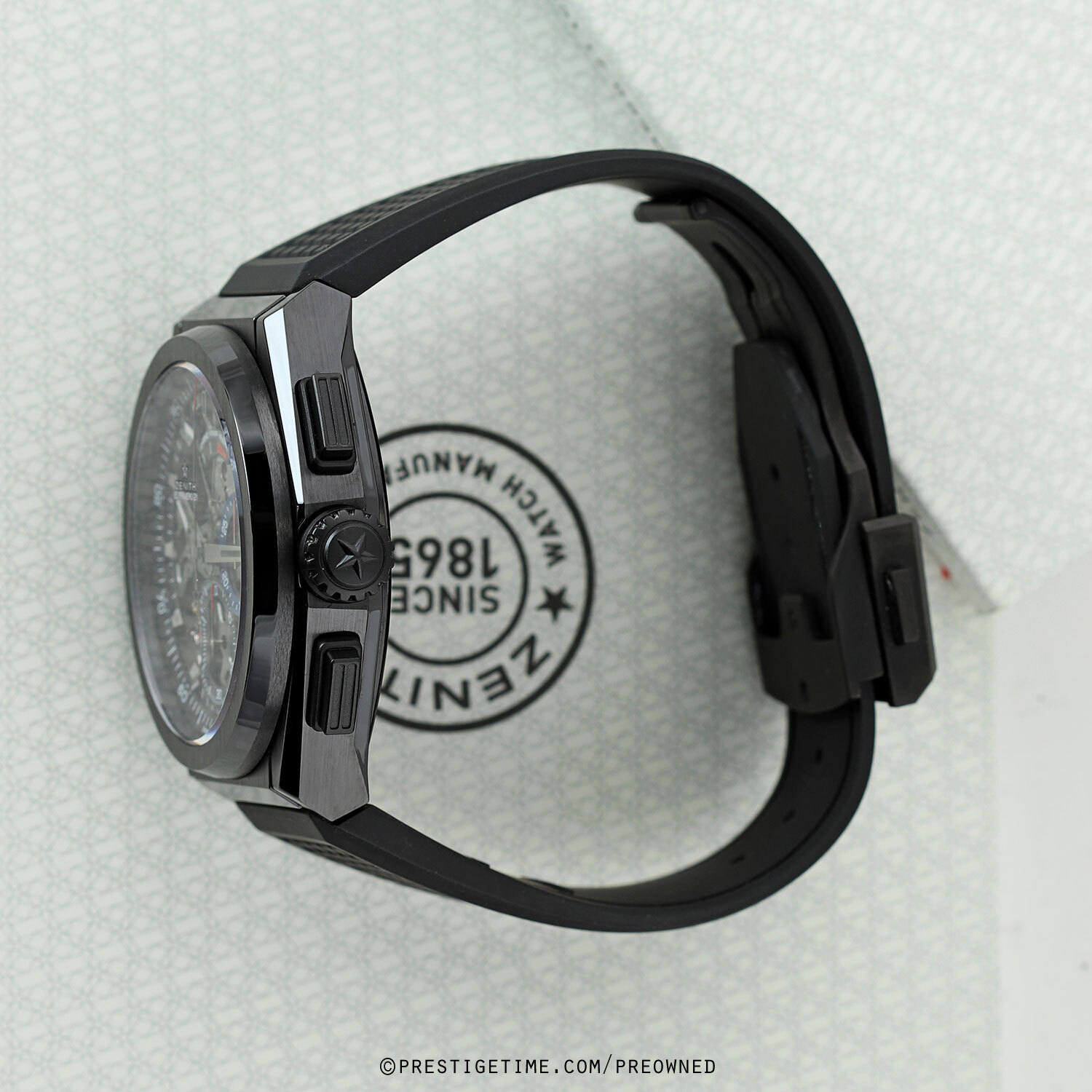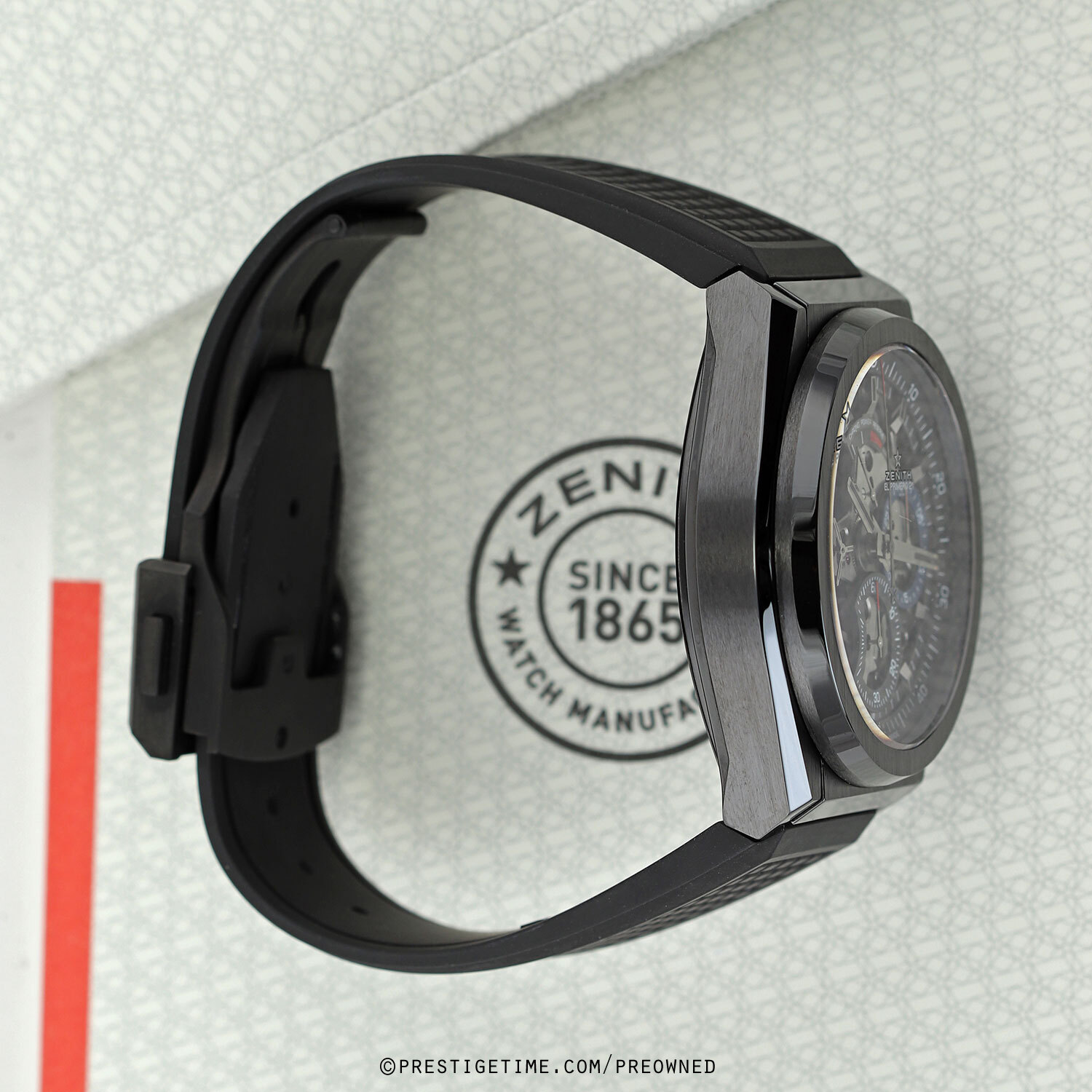 Strap: Fitted on its original Zenith black rubber strap with a push-button black deployant buckle. The strap is in pristine condition with its full wear lifespan remaining.