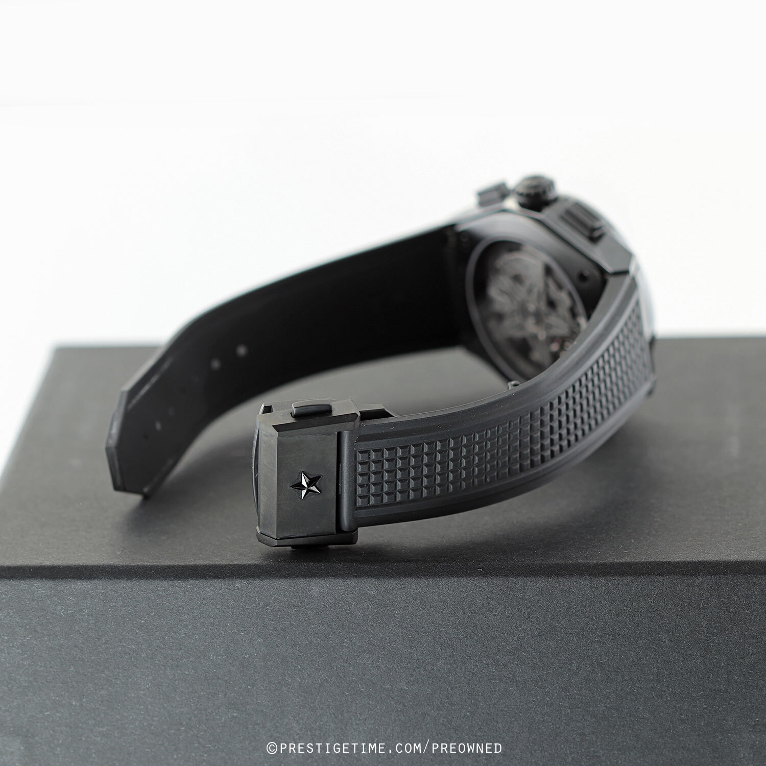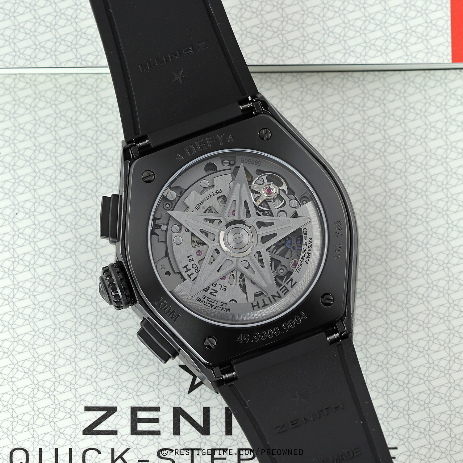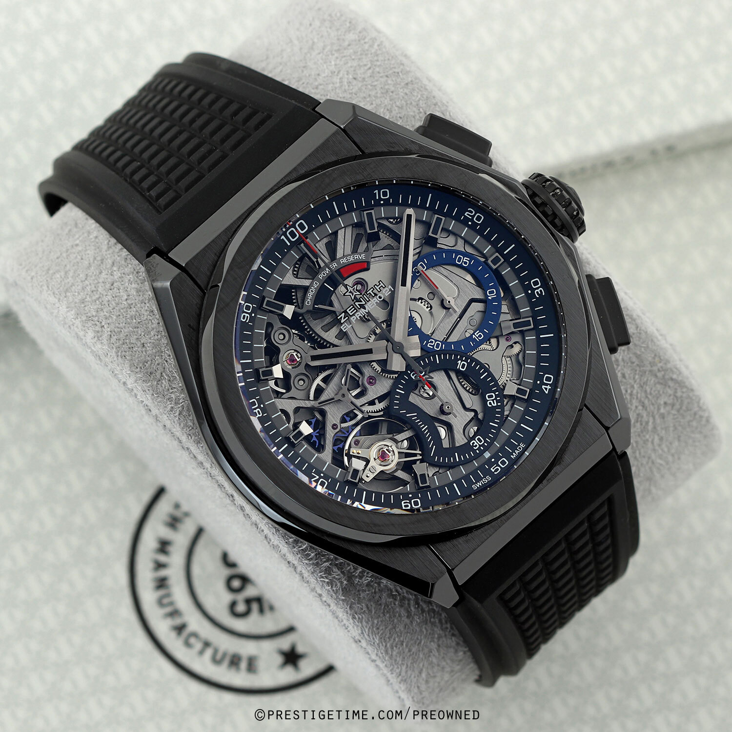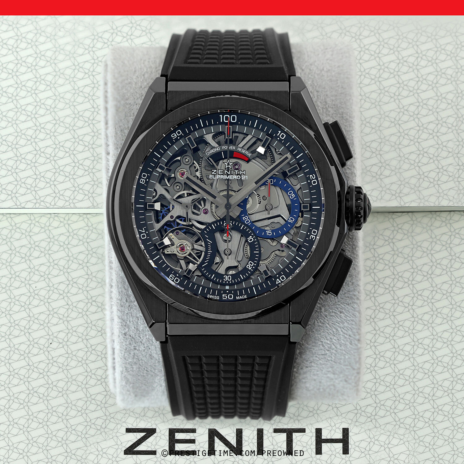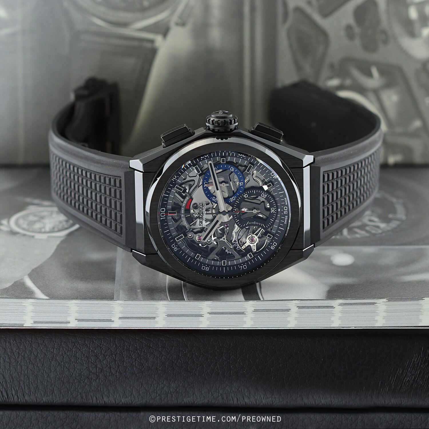 Strap: Fitted on its original Zenith black rubber strap with a push-button black deployant buckle. The strap is in pristine condition with its full wear lifespan remaining.