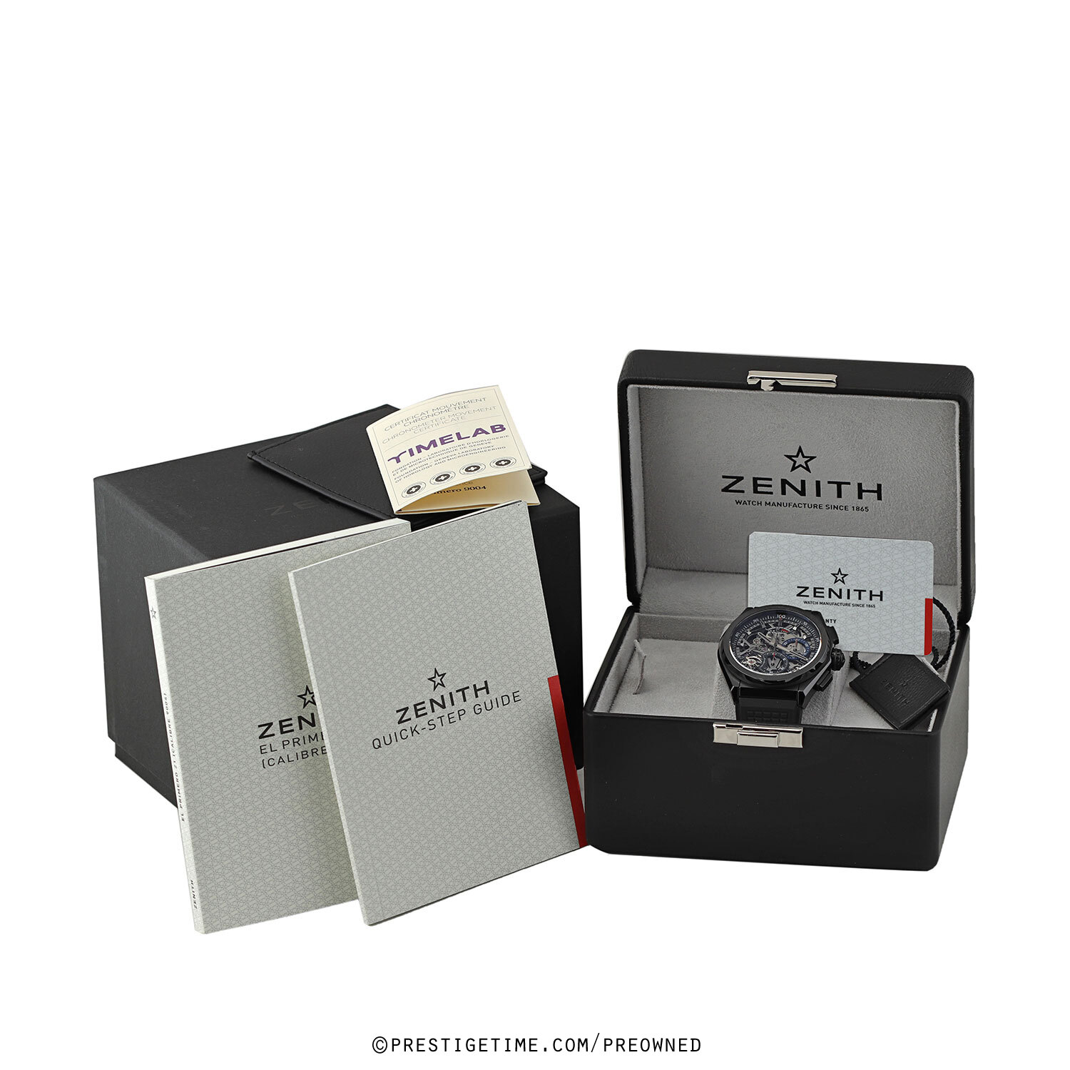 Movement: Powered by a Zenith in-house El Primero 9004 movement, dual escapements: watch escapement beats at 36,000 (5 Hz), the chrono escapement beats at 360,000 vpH (50Hz), contains 53 jewels & has a power reserve of +/- 50 hours.