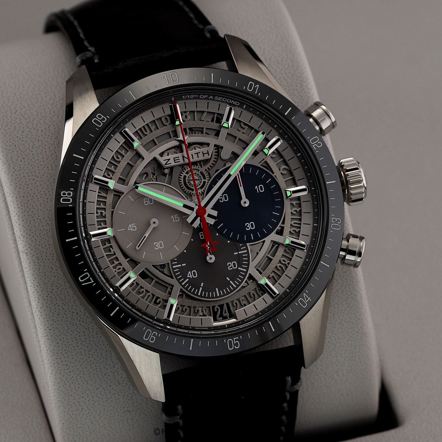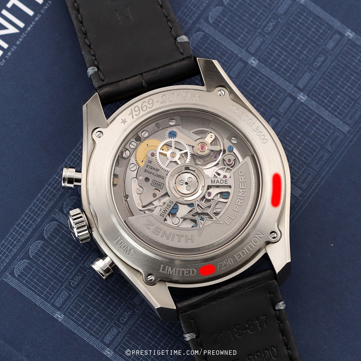 Movement: Powered by a Zenith El Primero caliber 3600, beats at high rate of 36,600 vph (5Hz), contains 35 jewels & has a power reserve of +/- 60 hours.