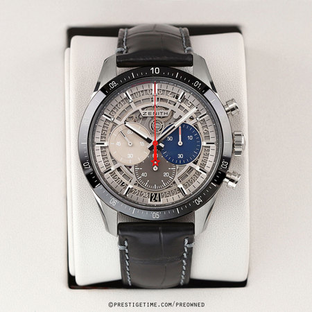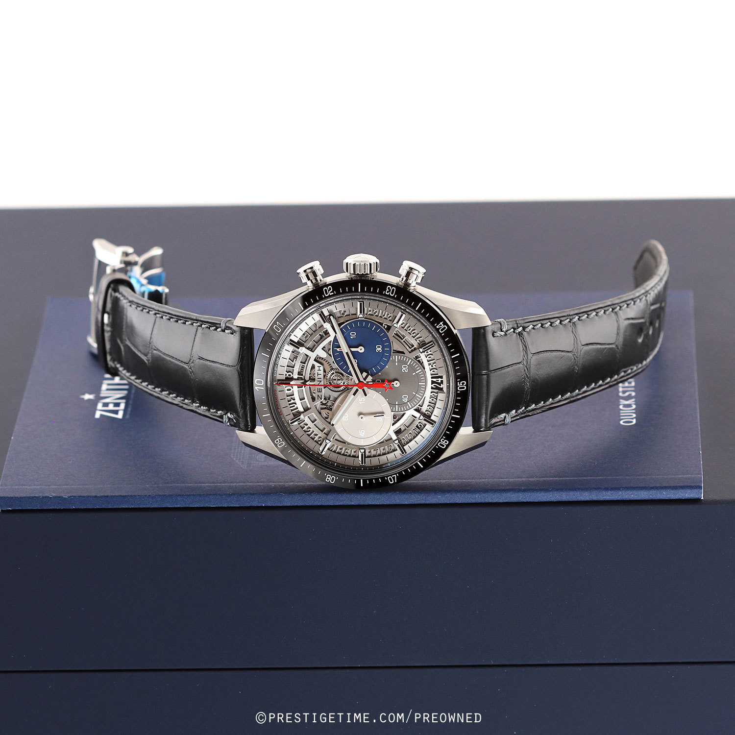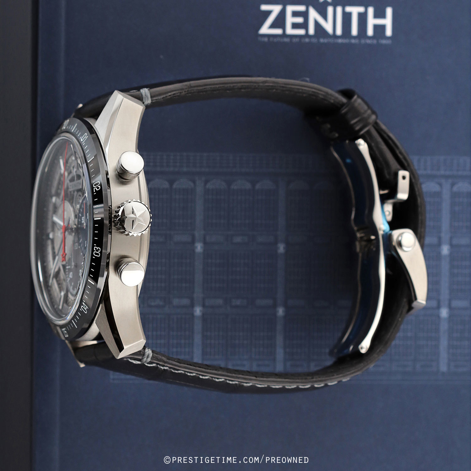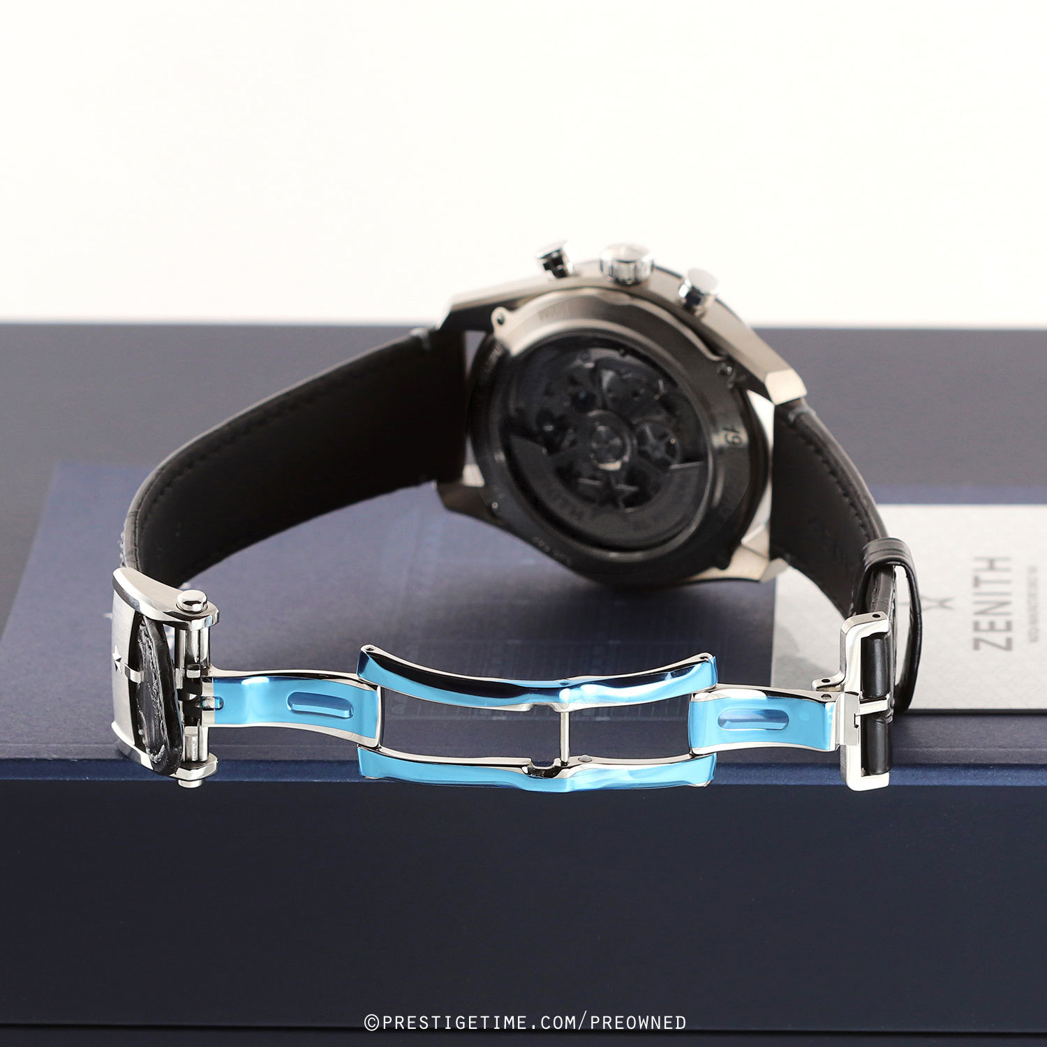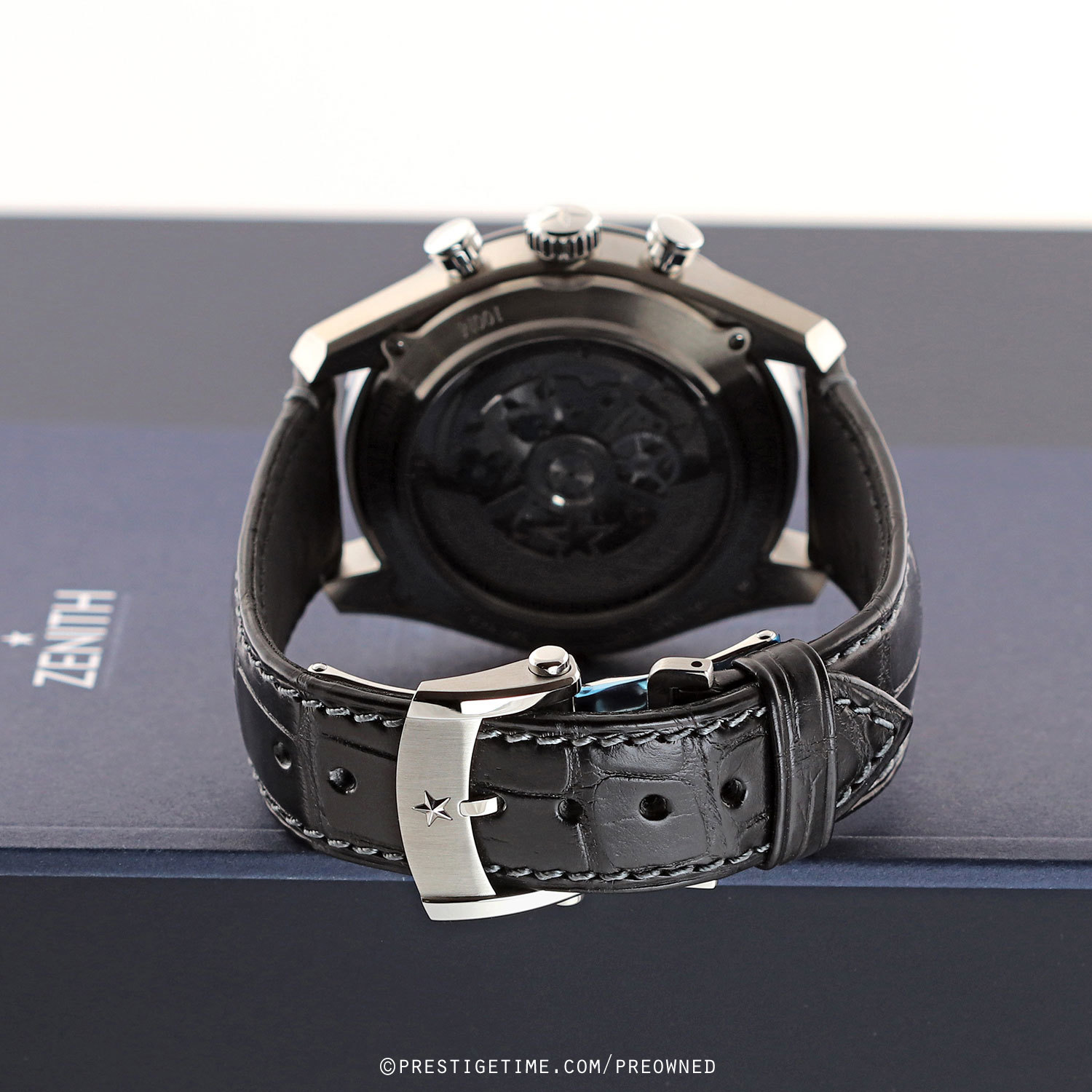 Strap: Fitted on its original Zenith black alligator leather strap with contrasting light grey stitching & a push-button deployant buckle. The strap is unworn and in brand new condition.